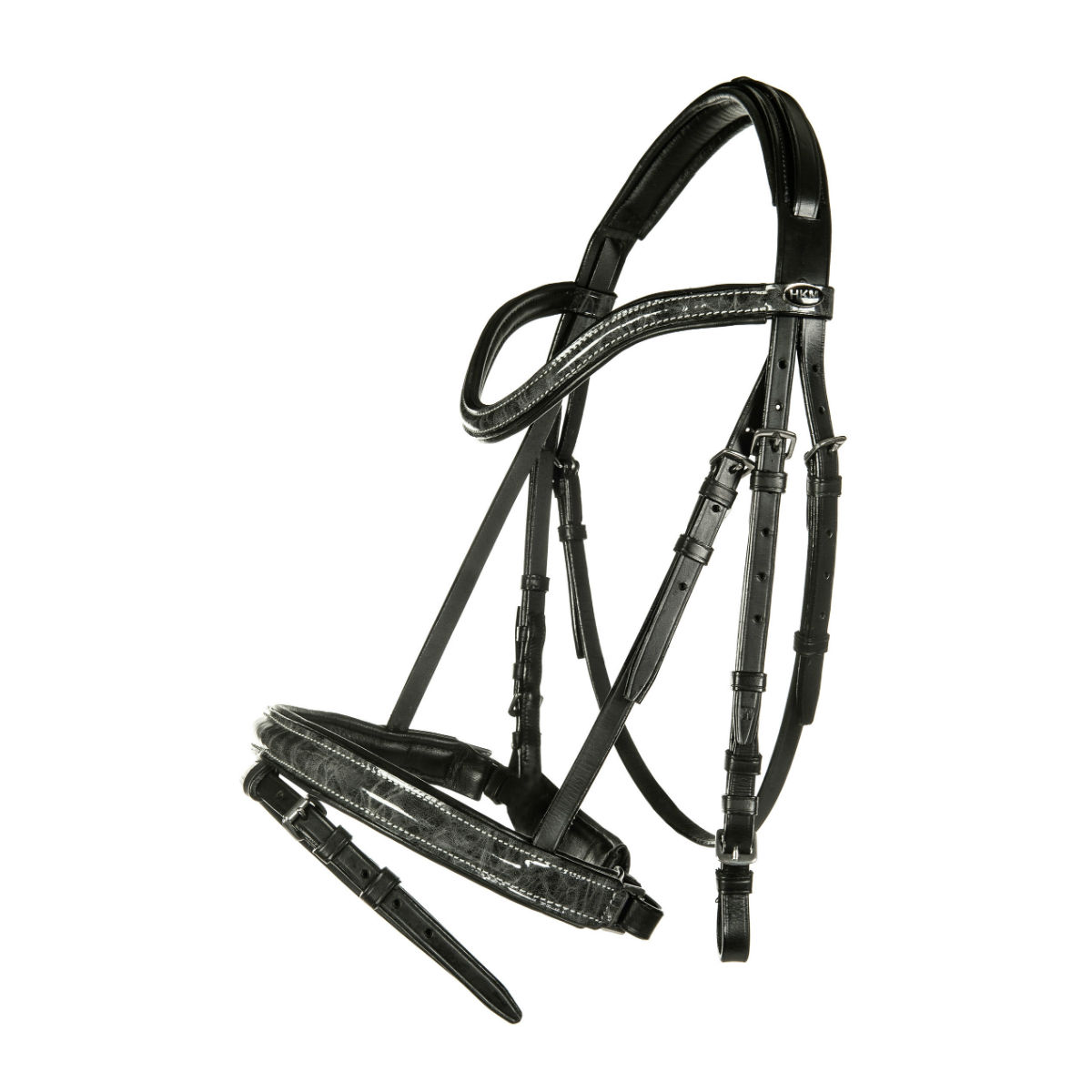 Мягкое трензельное оголовье (Leather Bridle) из яловичной кожи с декоративной белой вышивкой. Самозатягивающийся капсюль и затылочный ремень выполнены из лаковой кожи. Ремень капсюля проходит над затылочным ремнем. Прочные серебристые пряжки. Подложка на капсюле, затылочном и налобном ремнях сделана из мягкой кожи, что обеспечивает максимальный комфорт вашей лошади. В комплект входит тесьмяный повод с нашивкам против скольжения. Трензель в комплект не входит.