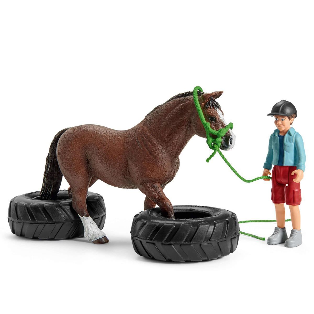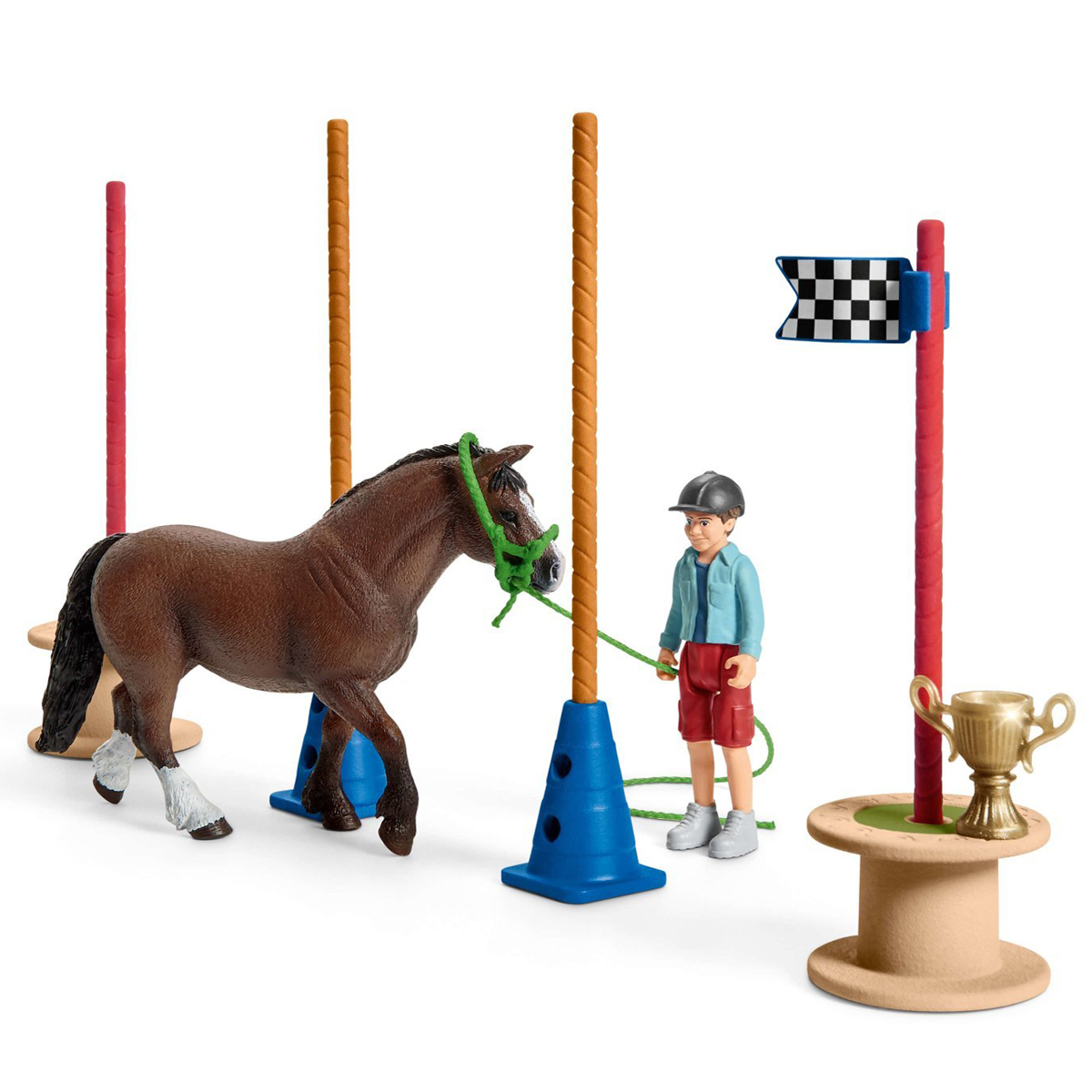 Если пони успешно пройдет серию тренировок, он сможет участвовать в соревнованиях по преодолению препятствий (аджилити). Ожидание и напряжение велики. Как будет подготовлена площадка для соревнований? Будет ли пони пугаться или уверенно пройдет все препятствия? Прохождение препятствий не менее интересно, чем скачки! Функции: • Возможность комбинирования разных препятствий • Подходят для больших и маленьких лошадей Schleich • Фигурка ребенка с подвижными руками и ногами! • Держатель для перекладин можно использовать в качестве пьедестала для победителей • Упрощенная уздечка для маленьких детей от 3 лет В наборе: • 1 уэльский пони • 1 мальчик • 1 шлем для верховой езды • 1 уздечка • 1 чумбур • 1 кубок • 2 кегли • 5 перекладин • 1 круговое препятствие • 3 факела • 2 колеса • 2 флага старт-финиш • 1 лист с наклейками