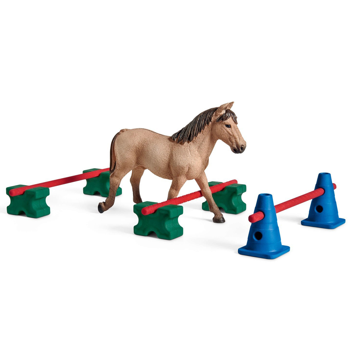 Слалом — один из видов работы на земле, он доставляет настоящее удовольствие! Пони не скачет, а спокойно обходит перекладины для слалома, поворачивая попеременно влево и вправо. Слалом способствует развитию интеллекта пони, хорошо сказывается на его здоровье, а также укрепляет доверие между людьми и животными. Во время слалома пони сначала ведут за недоуздок. После нескольких тренировок его можно снять. Функции: • Возможность комбинирования разных препятствий • Подходят для больших и маленьких лошадей Schleich • Из крестов кавалетти можно построить стену-препятствие В наборе: • 1 дюльменская дикая лошадь • 3 кегли • 3 перекладины • 5 крестов кавалетти
