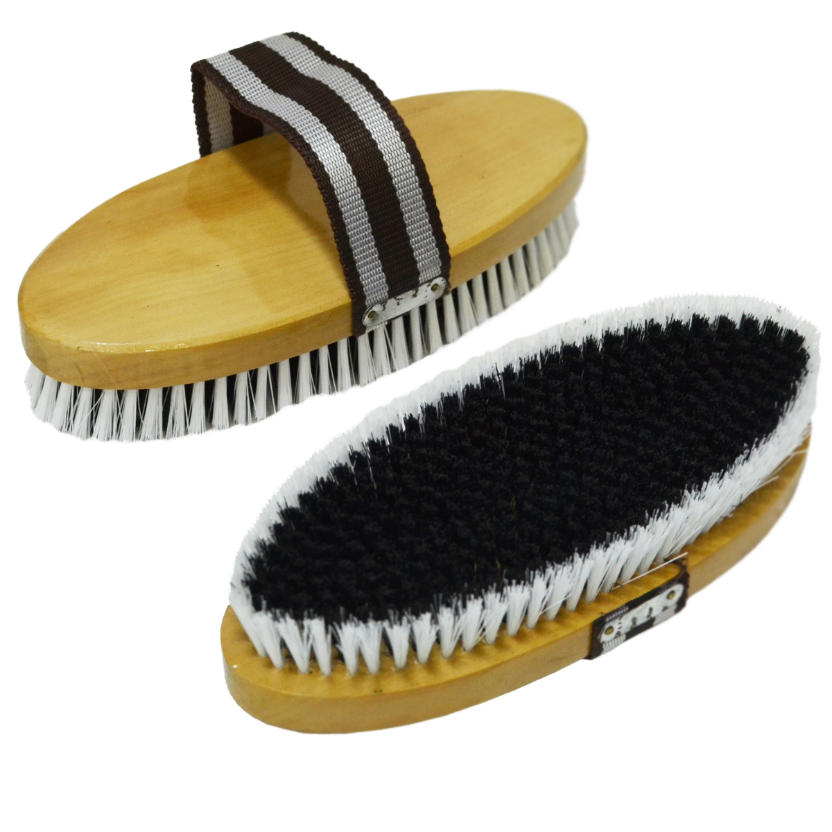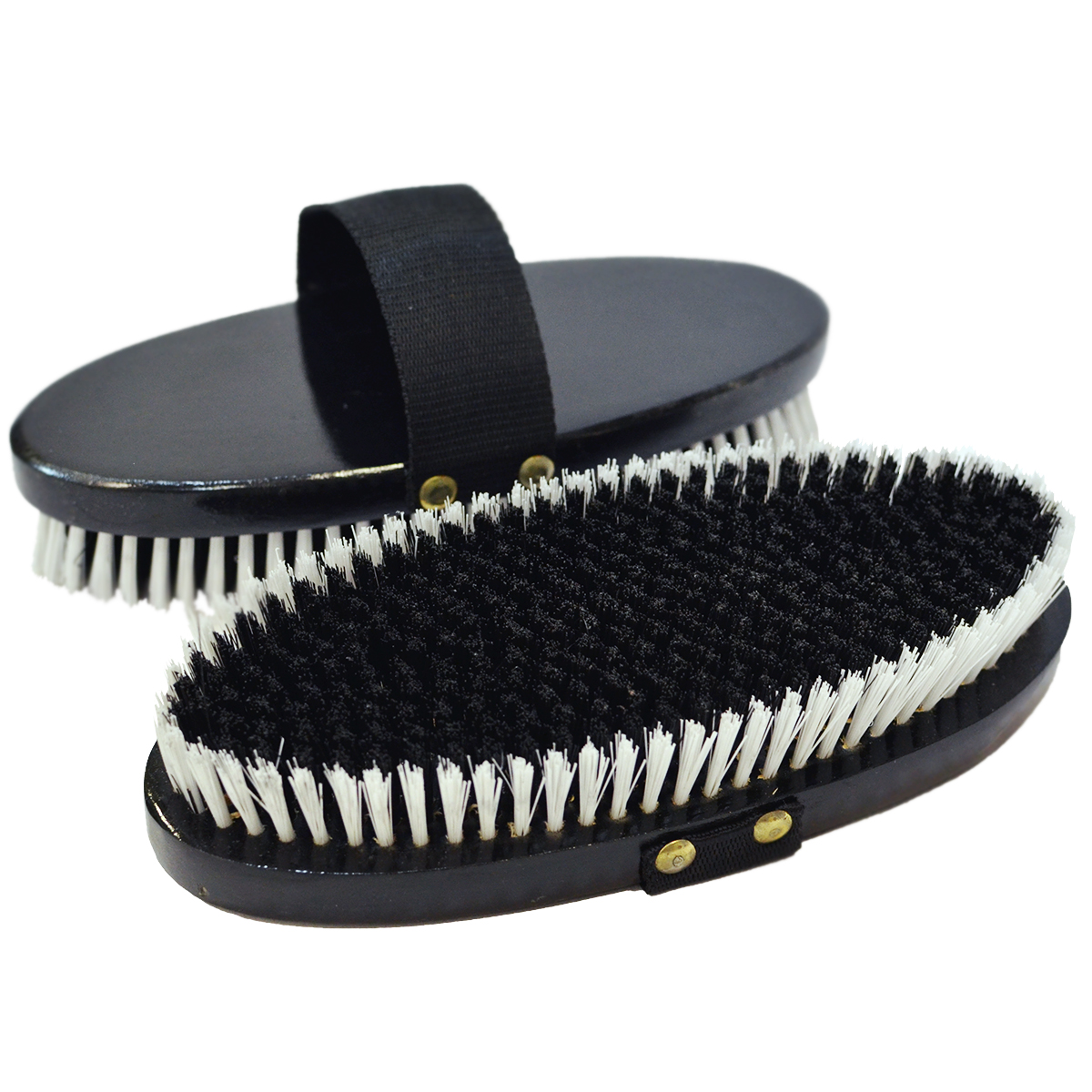 Большая щетка (brush) с искусственной щетиной на деревянной лакированной основе. Удобный ремешок для фиксации руки. Подходит для очистки тела после удаления основной грязи. Щетки средней жесткости отлично подходят для ежедневного применения. Чистка кожи и шерсти необходима для лошадей, которые большую часть времени проводят в конюшне.
