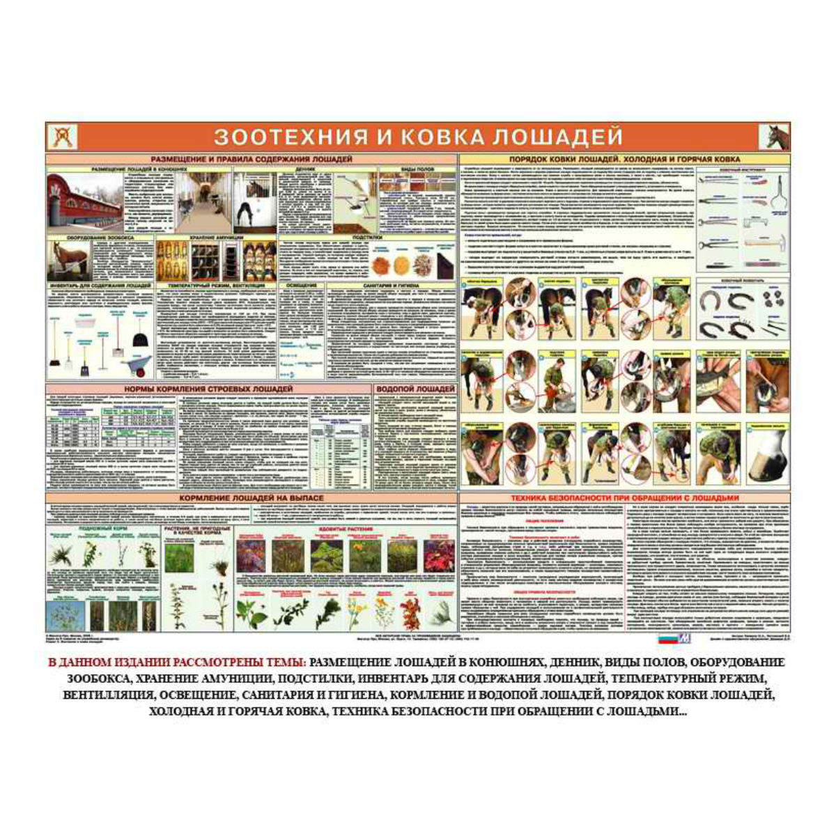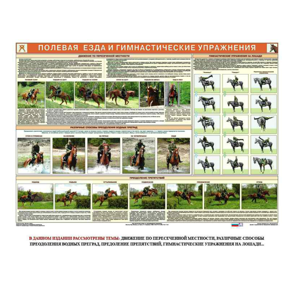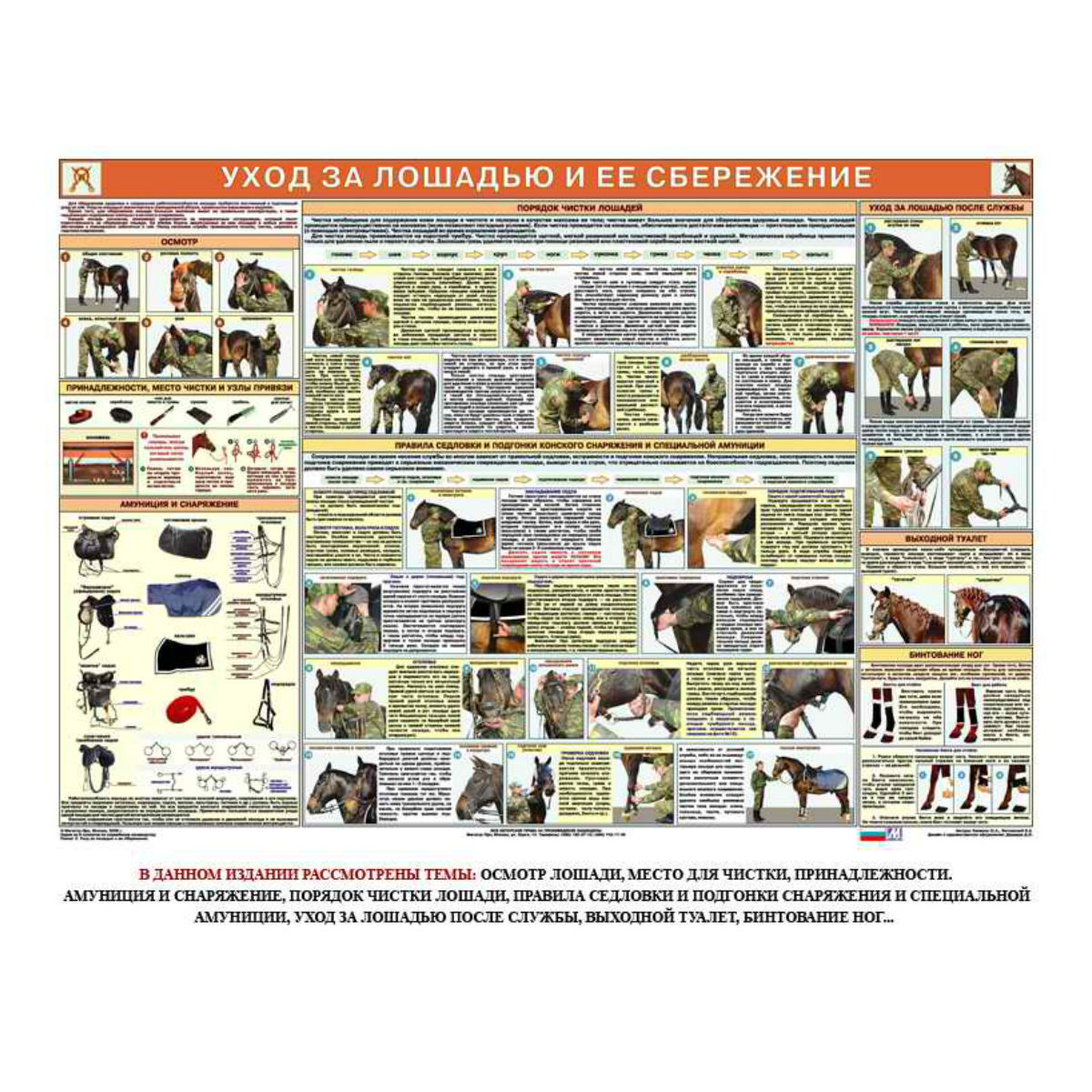 Наименования плакатов: -Породы лошадей, экстерьер и масти -Уход за лошадью и ее сбережение -Зоотехния и ковка лошадей -Ветеринария в служебном коневодстве -Основы и правила верховой езды -Полевая езда и гимнастические упражнения