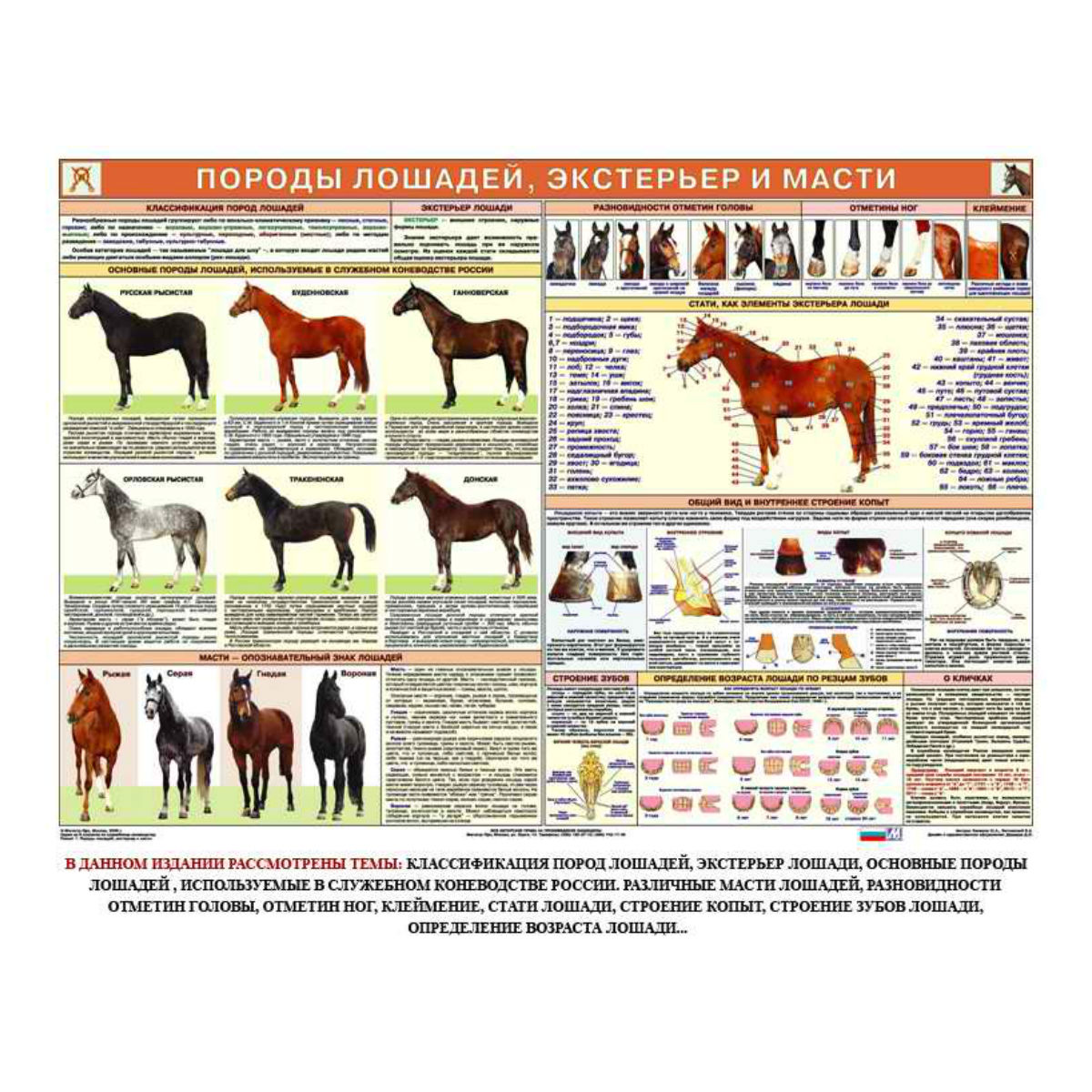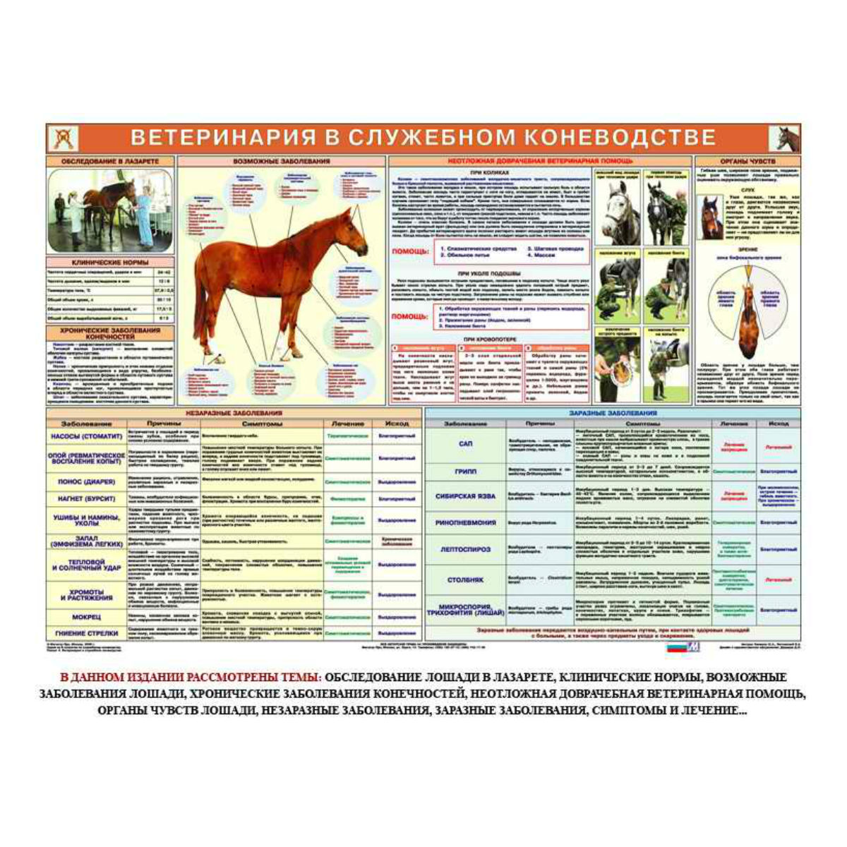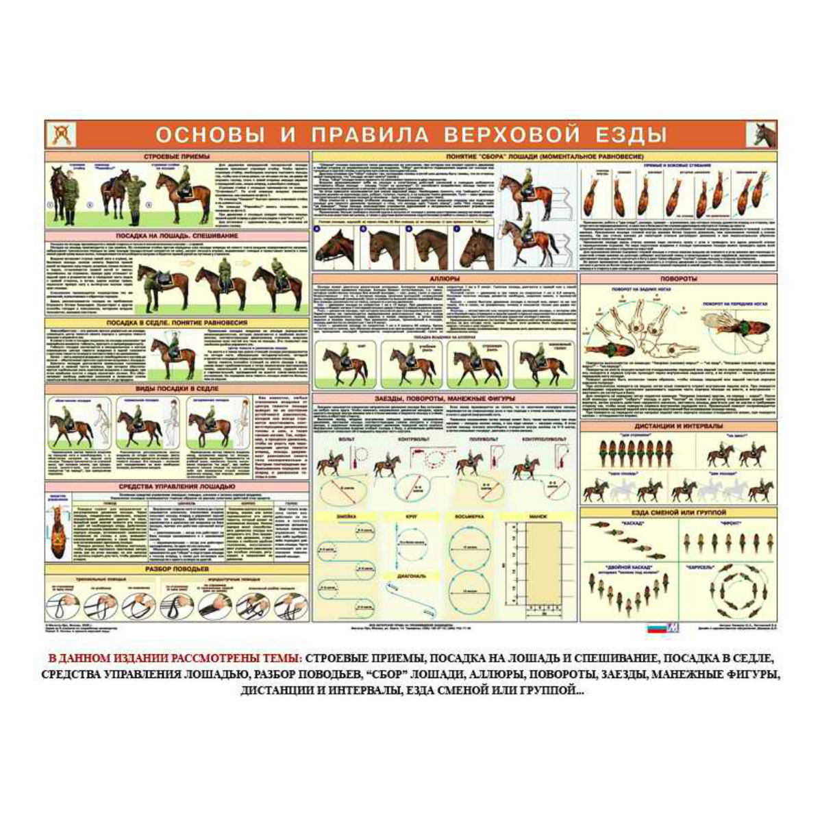 Наименования плакатов: -Породы лошадей, экстерьер и масти -Уход за лошадью и ее сбережение -Зоотехния и ковка лошадей -Ветеринария в служебном коневодстве -Основы и правила верховой езды -Полевая езда и гимнастические упражнения