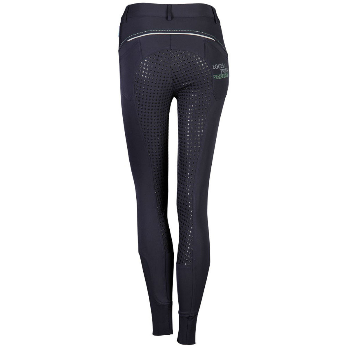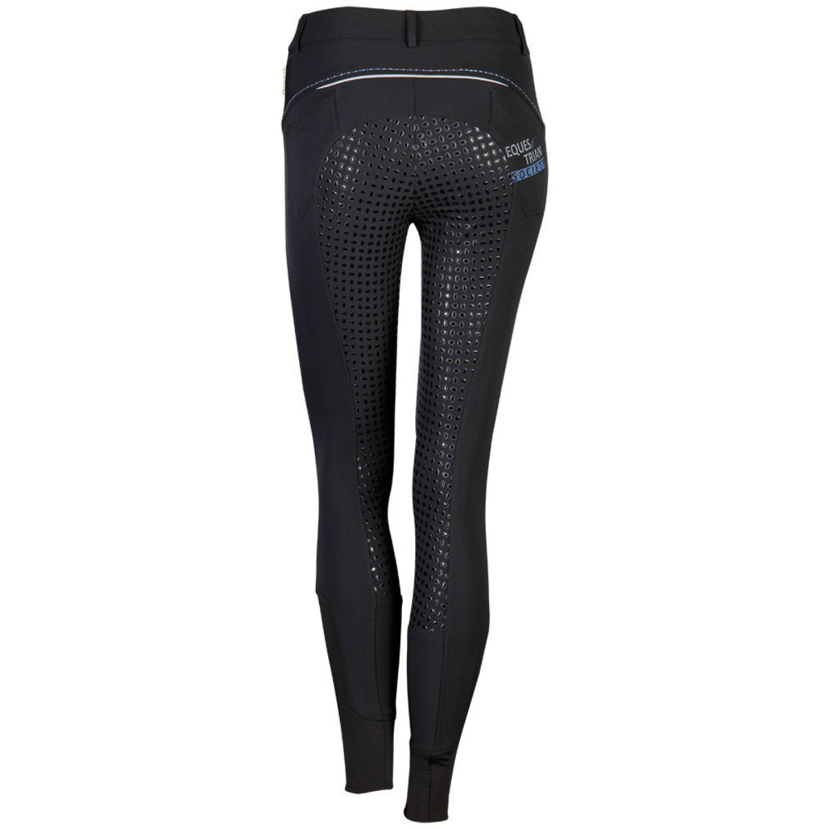 Стильные бриджи с полной силиконовой леей (Riding Breeches). Благодаря отличным эластичным качествам, бриджи хорошо обтягивают фигуру и прекрасно сохраняют форму. На поясе есть петли для ремня. Два передних набедренных кармана и два кармана сзади. Застёгиваются на молнию и брючный крючок. Бриджи украшены контрастной отстрочкой и принтом на заднем кармане. В области щиколотки имеется эластичная вставка для удобства одевания.