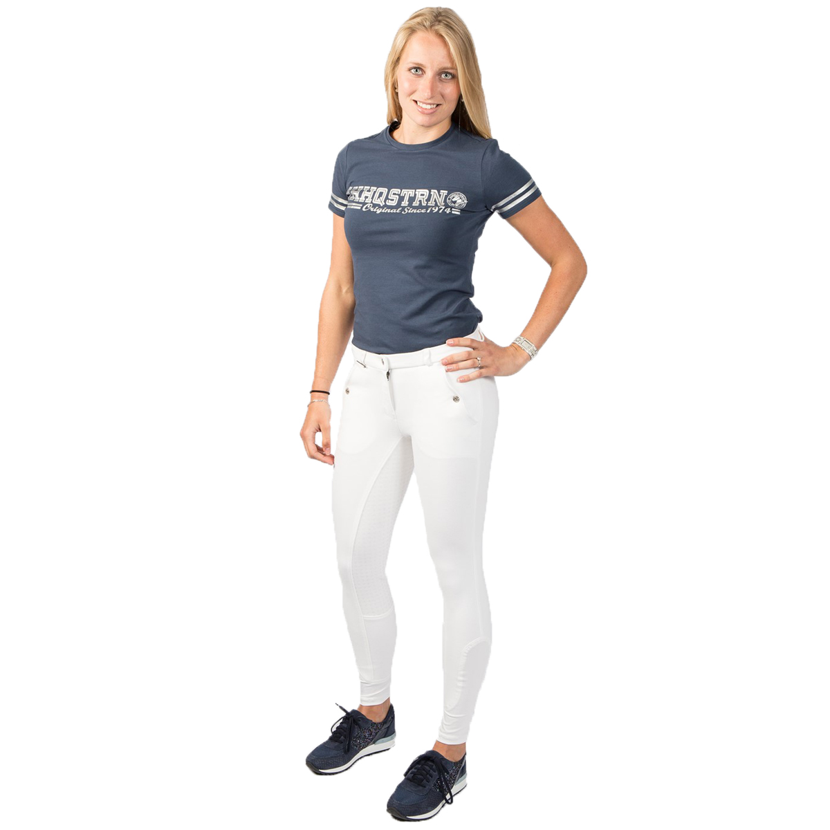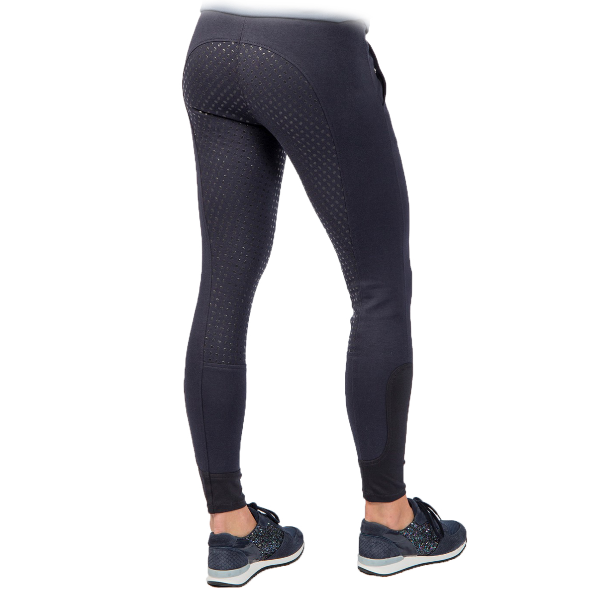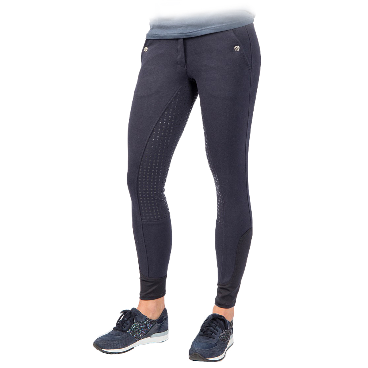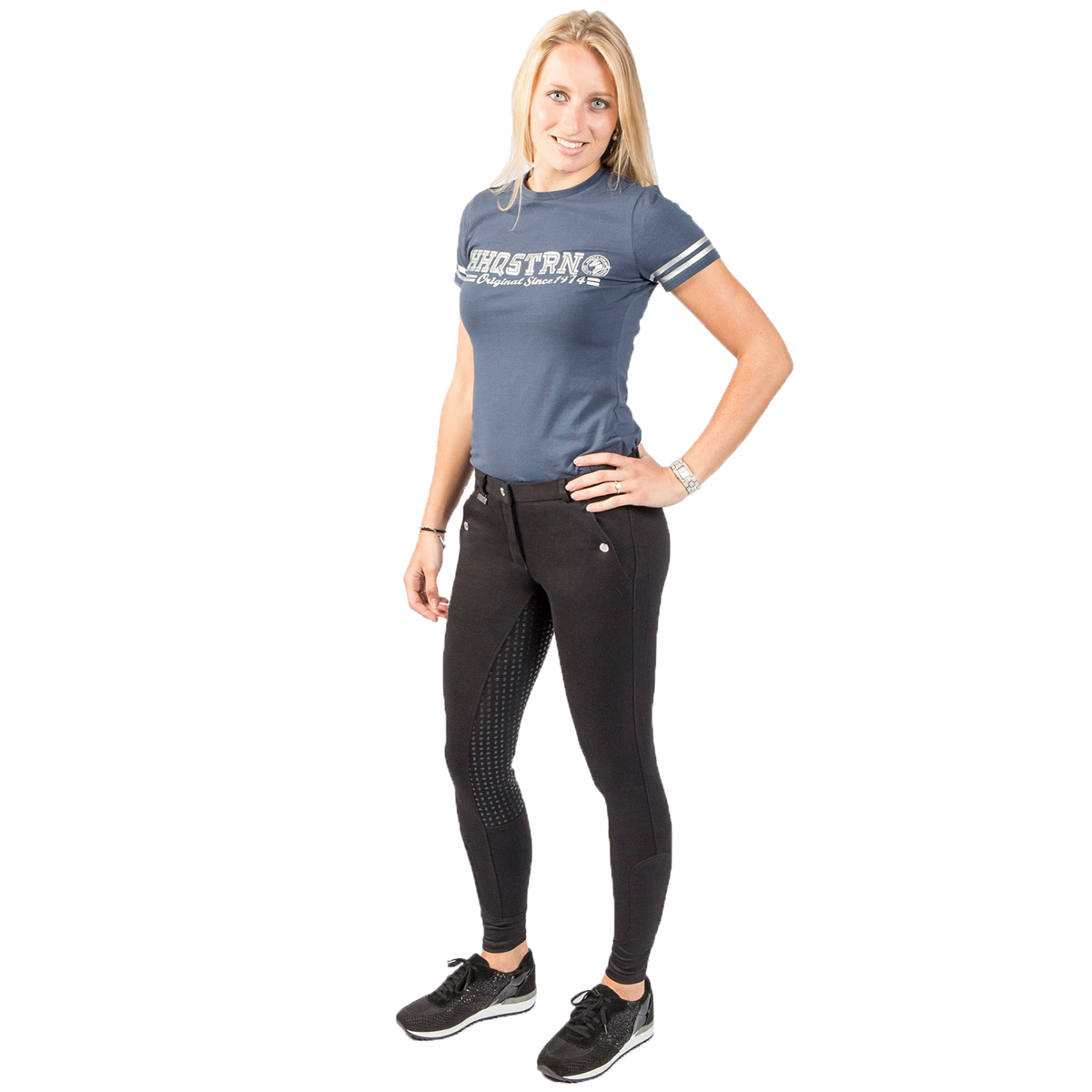 Бриджи с полной силиконовой леей (Riding Breeches). Благодаря высокому содержанию хлопка бриджи приятны к телу, а добавление спандекса позволяет им сохранять форму. На поясе есть петли для ремня. Два передних набедренных кармана на кнопках. Застёгиваются на молнию и брючный крючок. В области щиколотки имеется эластичная вставка для удобства одевания.