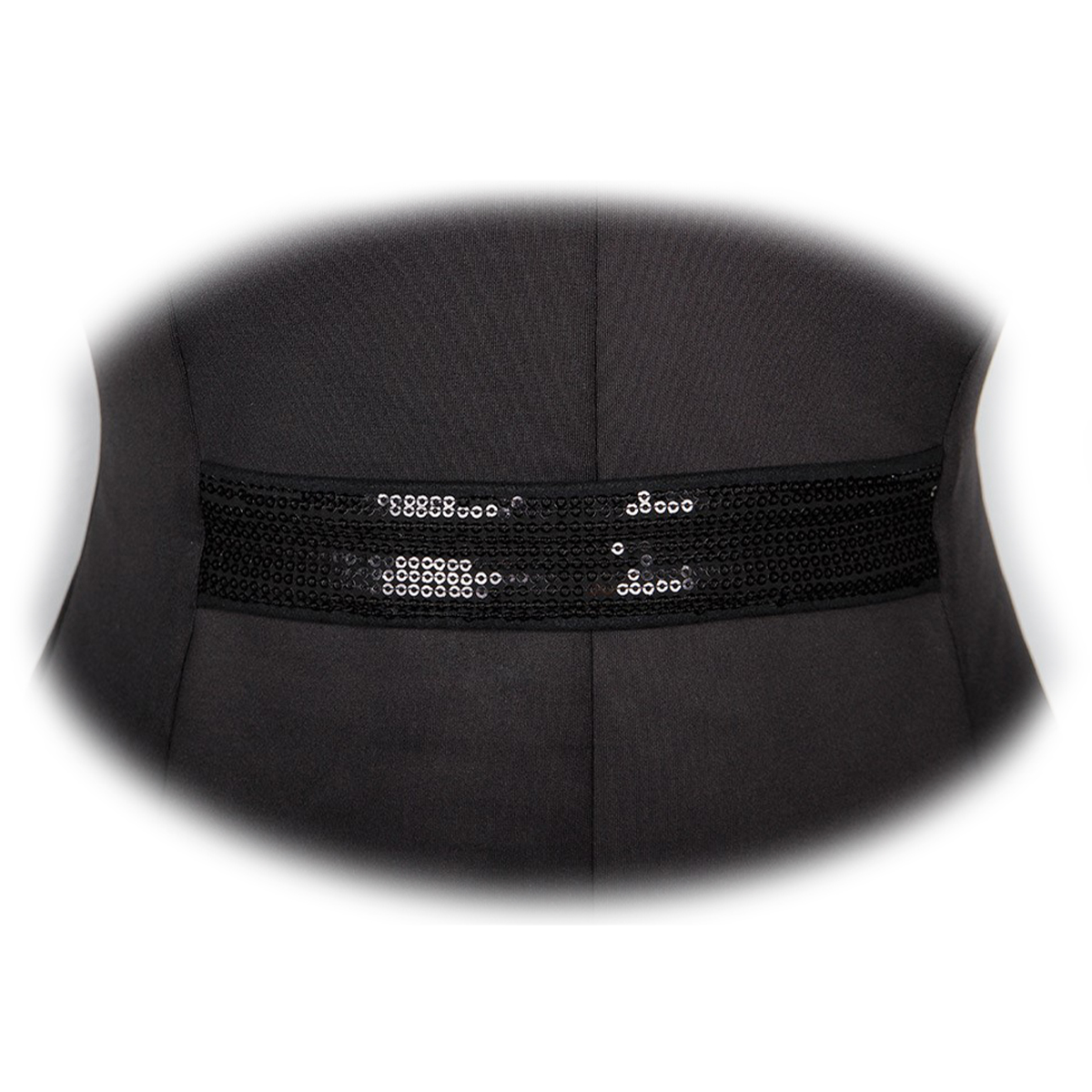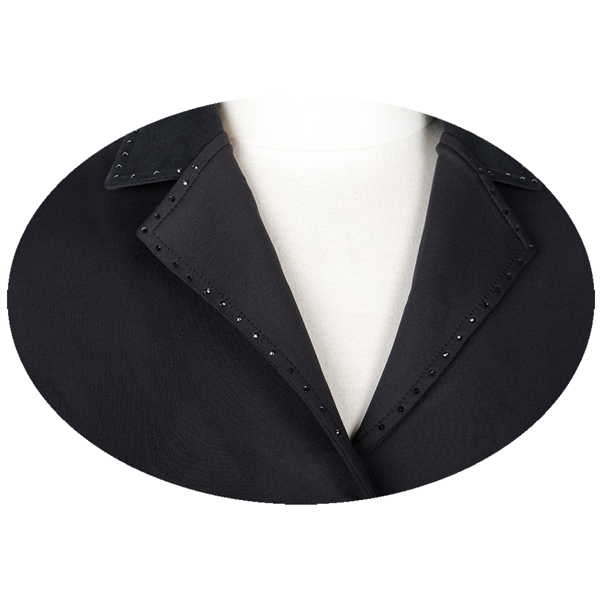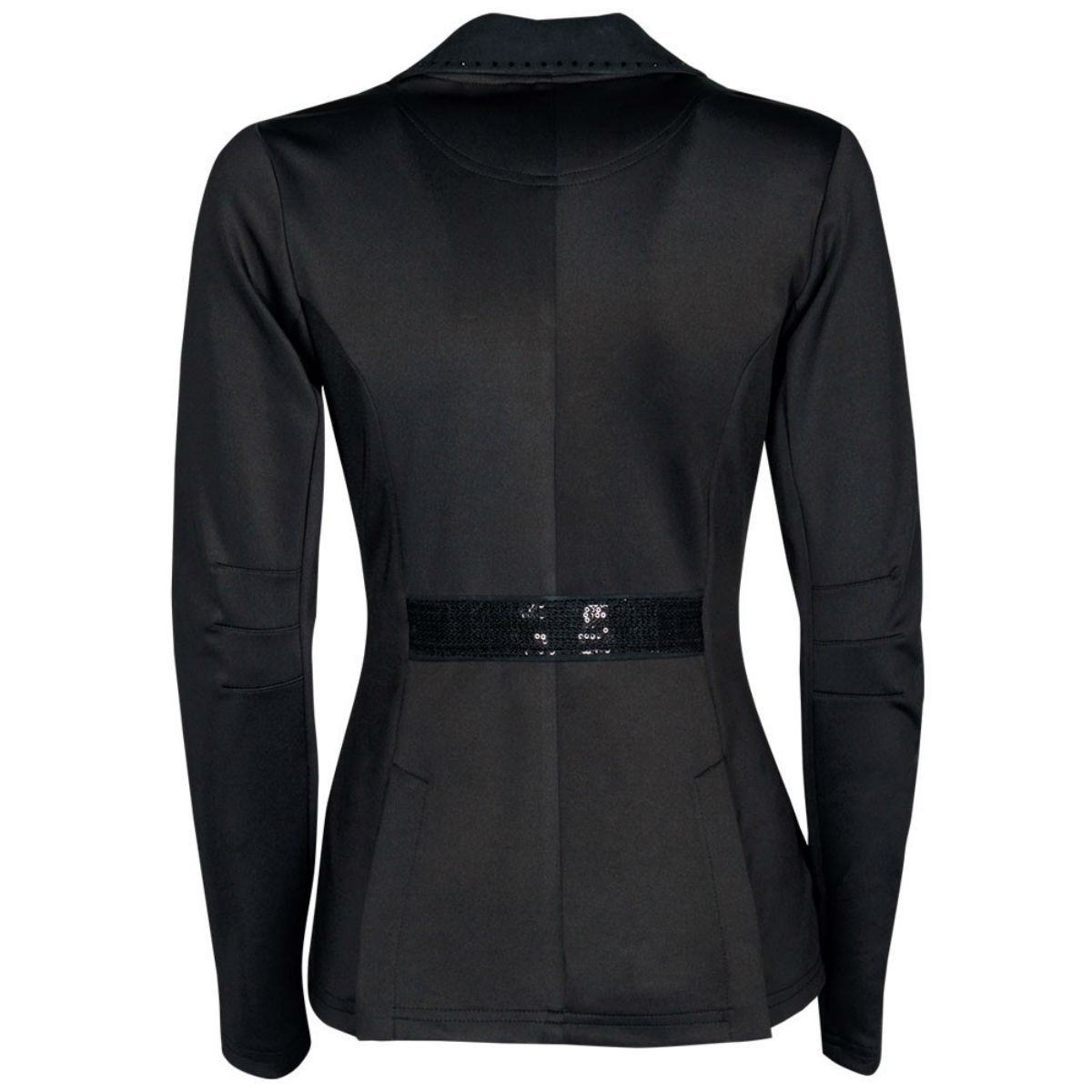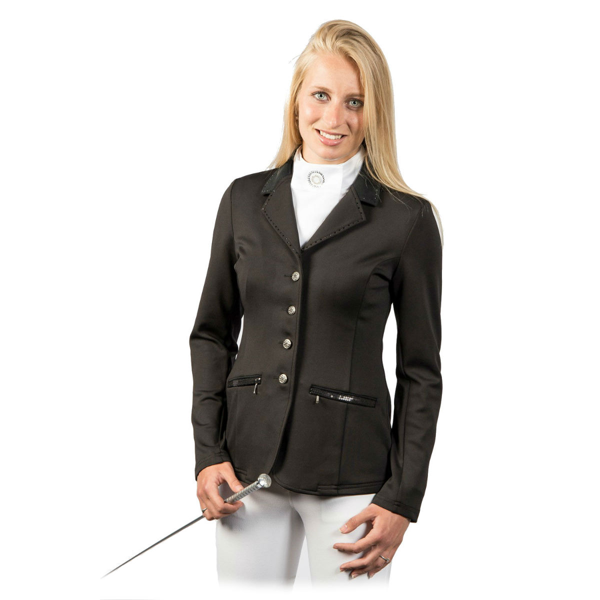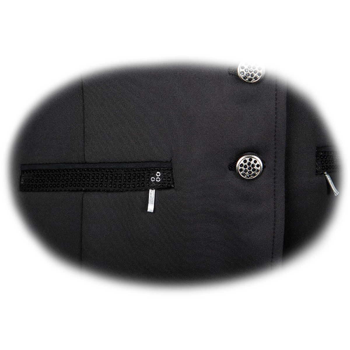 Элегантный приталенный редингот для выступлений (Competition jacket) из эластичной ткани. Карманы и декоративный пояс на талии сзади украшены пайетками. Воротник украшен стразами. Передние карманы на молнии и две шлицы сзади. Серебряные пуговицы украшены стразами.