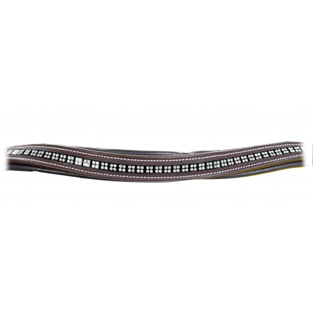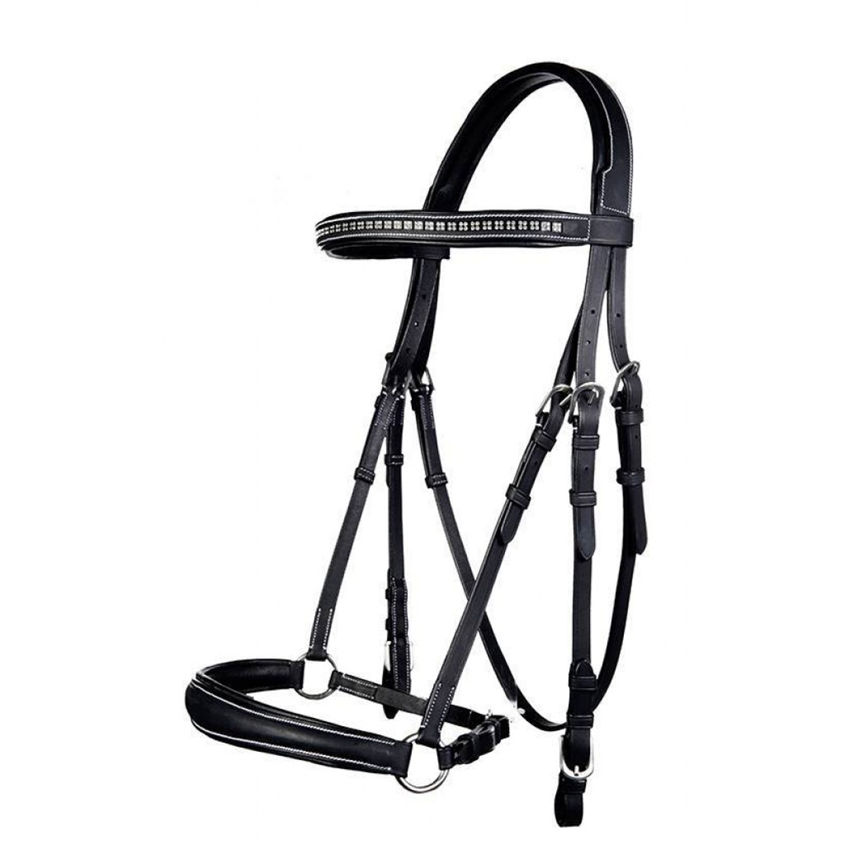 Оголовье из высококачественной натуральной кожи (Leather Bridle) с чешским капсюлем и контрастной отстрочкой. Налобный ремень украшен стразами. Мягкие подложки на капсюле, налобном и затылочном ремнях делает уздечку комфортной даже для чувствительных лошадей. В комплекте с уздечкой идет тесьмяный повод с ограничителями и нашивками против скольжения. Кожа высокого качества и крепкая фурнитура обеспечат долгую службу уздечки. Трензель в комплект не входит.
