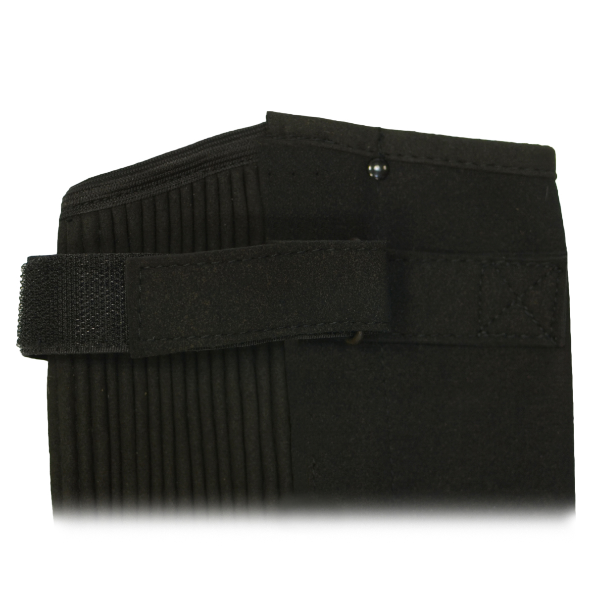 Краги из искусственной замши. Имеется эластичная вставка по всей длине, что обеспечивает плотное прилегание краги к ноге. Верхняя застежка на липучке, в нижней части присутствует защитный язычок. Отделка контрастным кантом. Все края обшиты тесьмяной полосой, что придает более привлекательный вид и позволяет дольше сохранить форму. Дополнительное усиление в области застежки. Легко стираются при температуре 30 С.