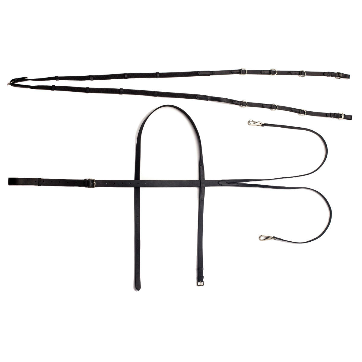 Комплект состоит из подперсья с поводом, кожаные части комбинируются с тесьмяными. Повод оказывает скользящее действие на трензель, может фиксироваться в трёх положениях за счет перестёгивания карабинов. Вся фурнитура серебристого цвета. Размер универсальный Cob-Full.