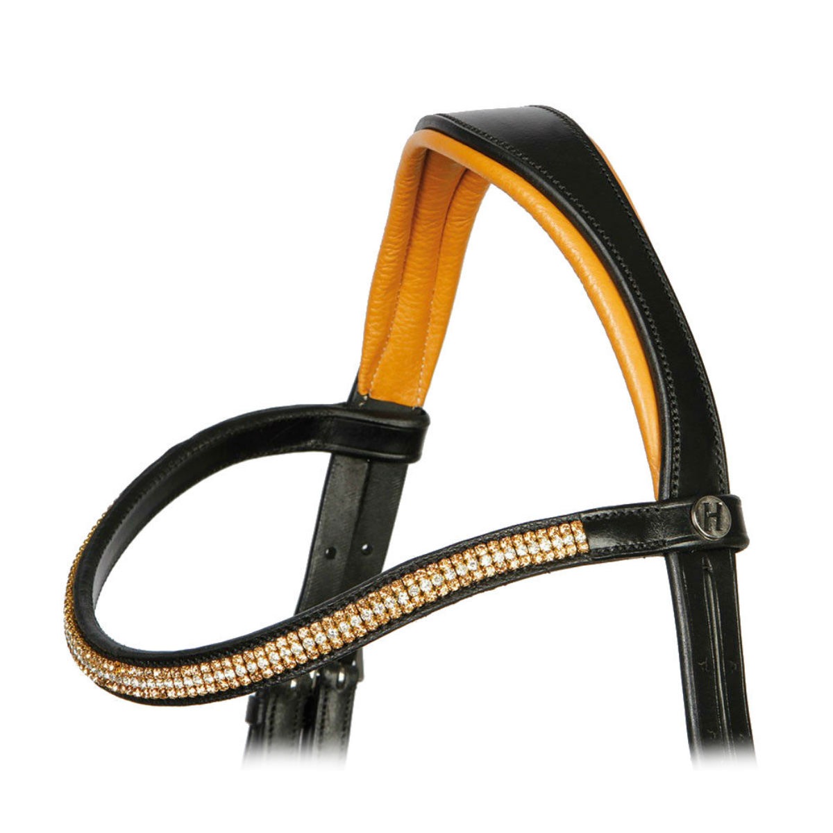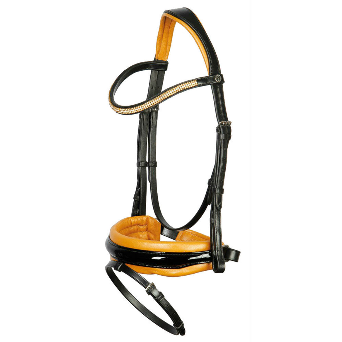 Оголовье из кожи (Leather Bridle) высокого качества с самозатягивающимся капсюлем. Затылочный ремень анатомической формы на мягкой подложке. Уздечку украшает стильный налобник с кристаллами. Широкий капсюль с объемной и мягкой подложкой. Фурнитура серебряного цвета из нержавеющей стали. Нащёчные ремни и повод застегиваются на крючки. В комплект входит тесьмяный повод с нашивками против скольжения. Трензель в комплект не входит.