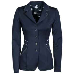 Стильный редингот для выступлений (Competition Jacket for Women) приталенного кроя из плотного трикотажа. Редингот застегивается на молнию и четыре пуговицы. Два кармана с контрастной строчкой. На воротнике три серебряные звездочки и контрастная строчка. Две шлицы сзади. Подклад из сетчатой ткани со звездным принтом.