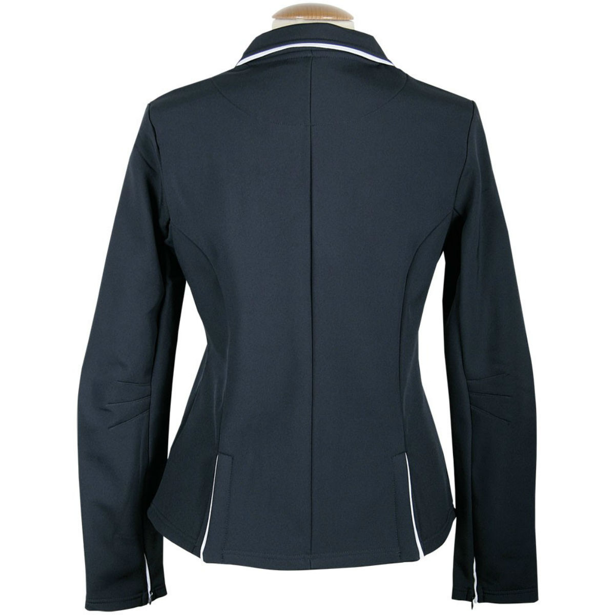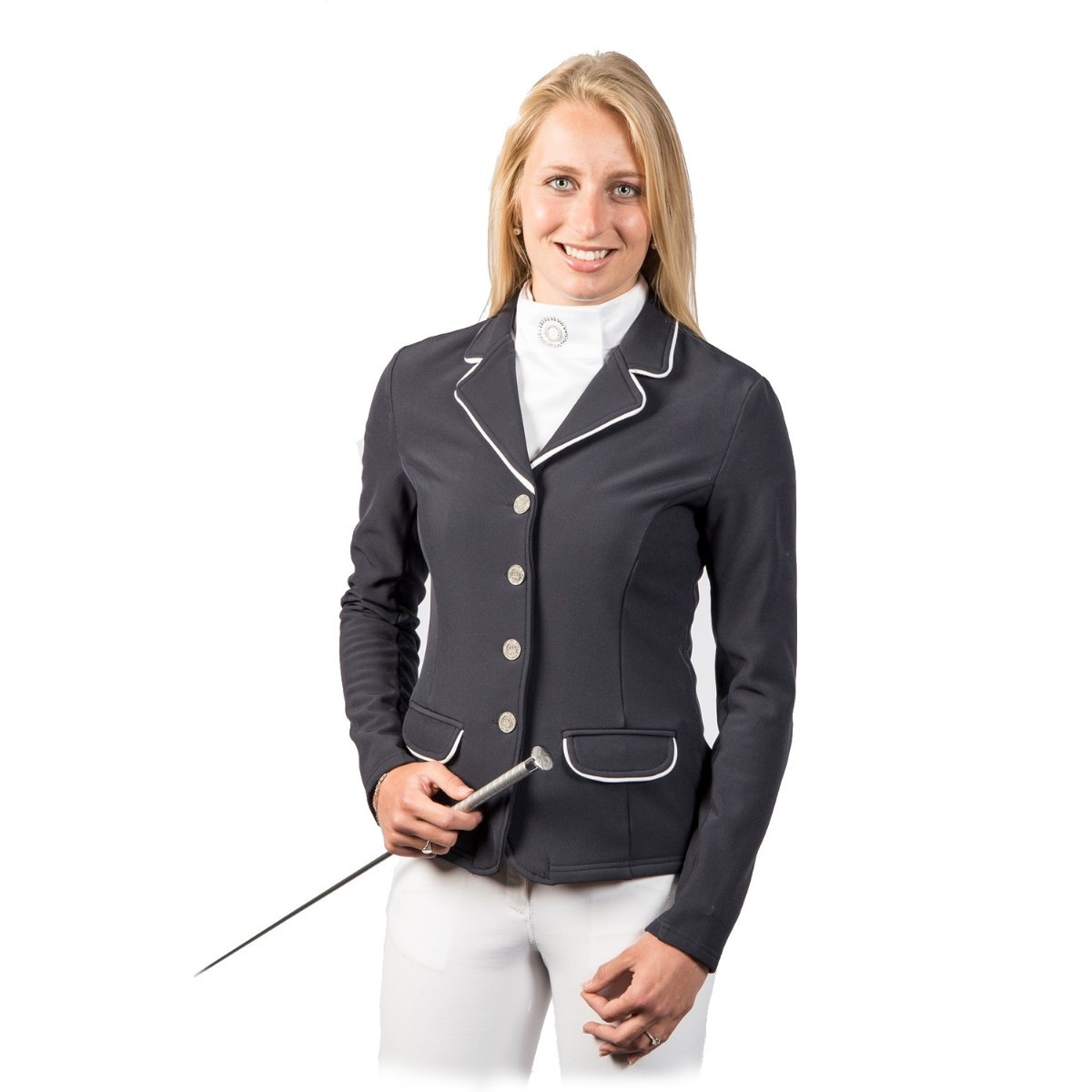 Элегантный дамский редингот для выступлений (Competition Jacket for Women) из ткани софтшел с флисовым подкладом. Софтшел - легкая ткань с двойным эффектом не пропускает воду, хорошо отводит влагу и обладает охлаждающим эффектом, в результате чего обеспечивает отличную терморегуляцию. Износостойкий, прочный материал. Редингот приталенного кроя, украшен контрастной отстрочкой. Редингот на четырех пуговицах. Два кармана и две шлицы сзади. Серебристые пуговицы с логотипом украшены стразами.
