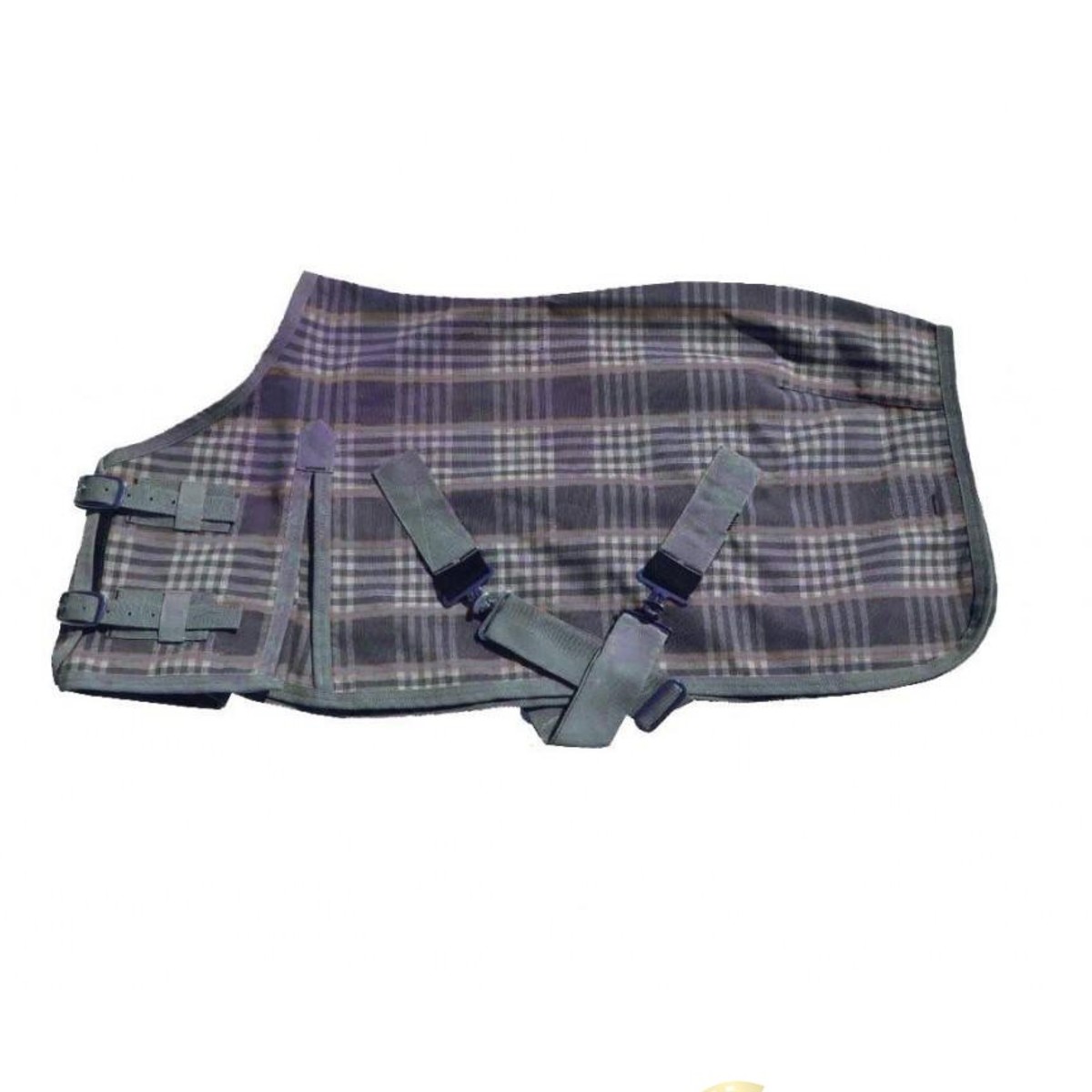 Легкая денниковая попона без подкладки. Подходит в качестве транспортировочной. Практичная, удобный крой. Плечевые вытачки дают свободу движениям. На попоне двойные застёжки спереди и перекрещивающиеся попонодержатели, ремень под хвостом. Гладкая, легко чистящаяся ткань. К ткани практически не липнут опилки, что облегчает ежедневное использование попоны.