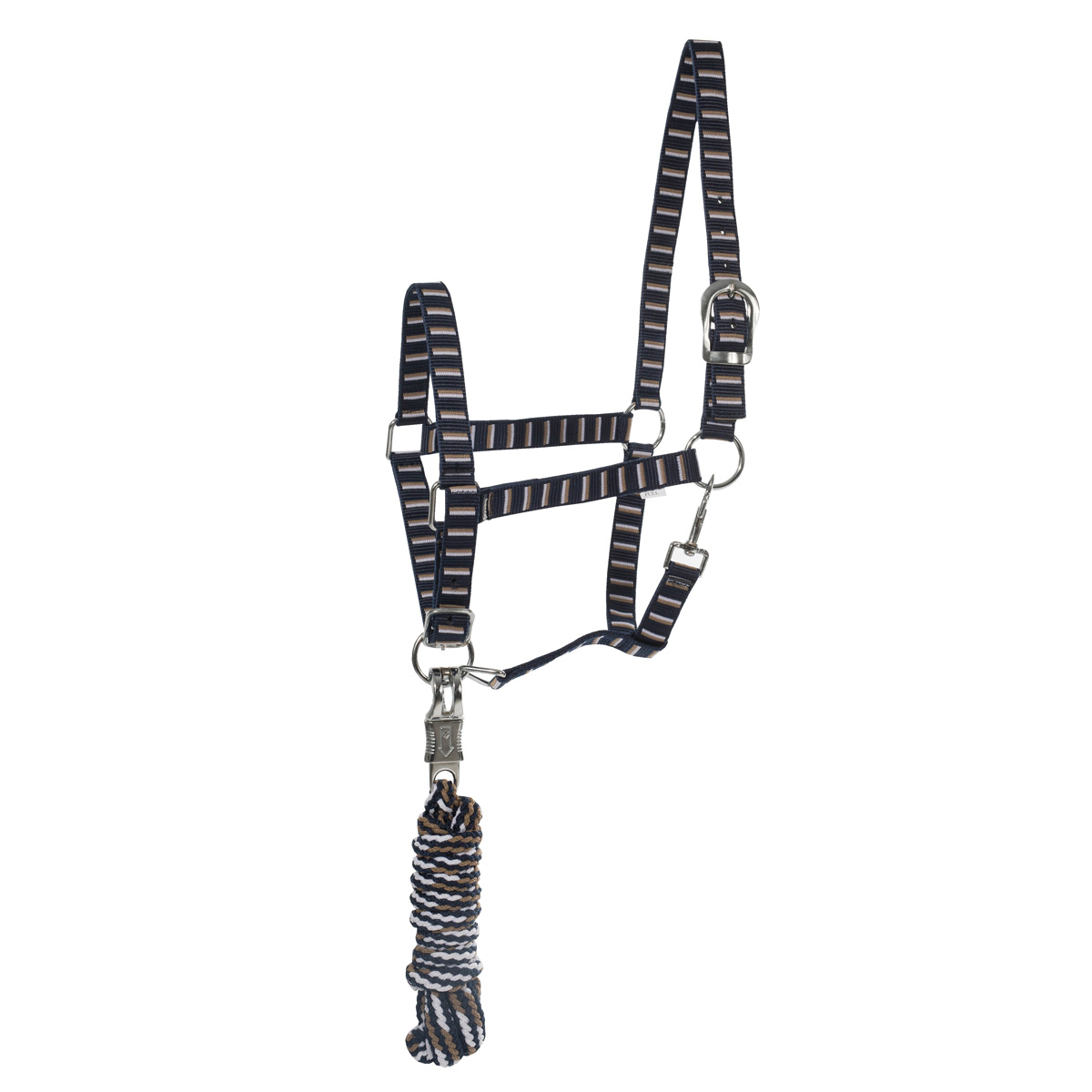 Недоуздок в комплекте с чумбуром (Halter and Lead Set) с ярким дизайном выделит Вашу лошадку из толпы. Недоуздок и чумбур изготовлены из качественного прочного нейлона. Затылочный ремень на недоуздке регулируется. Фурнитура хромированная. На чумбуре длиной 2 м имеется быстроразъемный карабин "Panic". Сочетание разных узоров на материале: всегда модной клетки на недоуздке и полосок на чумбуре - выглядит гармоничным благодаря единству их цветовой гаммы.