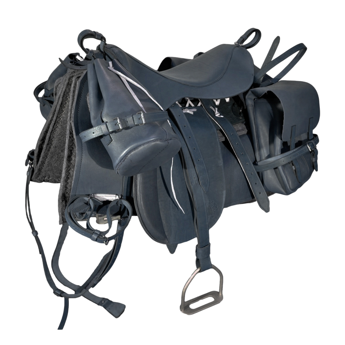 В комплект входит: седло, потник войлочный, потник кожаный подбитый войлоком, уздечка с выводным поводом (205 см), круговая подпруга, нагрудник, повод (270 см), путлища, стремена, 2 сумины большие и 2 маленькие с вьючными ремнями.