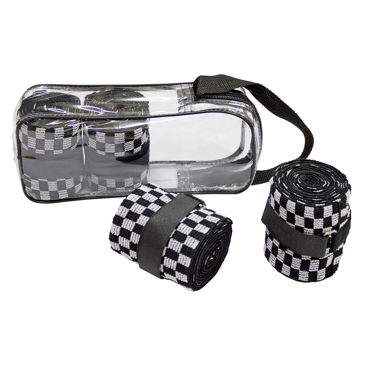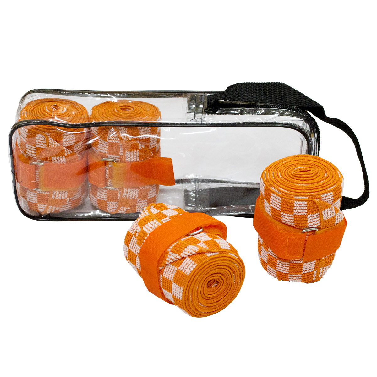 Очень легкие и прочные бинты. Липучка изготовлена из липкой ленты шириной 2 см, проходящей через кольцо. Позволяя более прочно закрепить бинт на ноге лошади, липучка проходит через кольцо и в обратную сторону. Это делает бинты простыми в использовании. Популярная модель для рысаков - эластичные бинты эффектно смотрятся на ногах лошади. Желательно использовать их только во время соревнования, т.к. они перетягивают ноги лошади, что может привести к нарушению кровообращения. Набор из 4 штук в сумочке из полиэстера.
