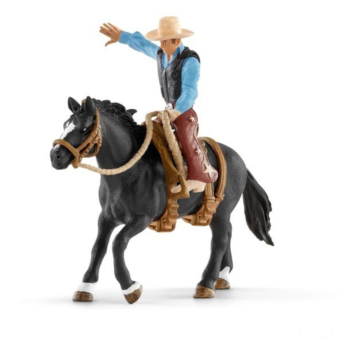 Отзывы Фигурка ковбоя в седле на необъезженной лошади от Schleich приведет в восторг любого малыша. Ребенок сможет придумать множество разных сюжетов скачек и профессиональных соревнований, задействовав другие фигурки Scheich.