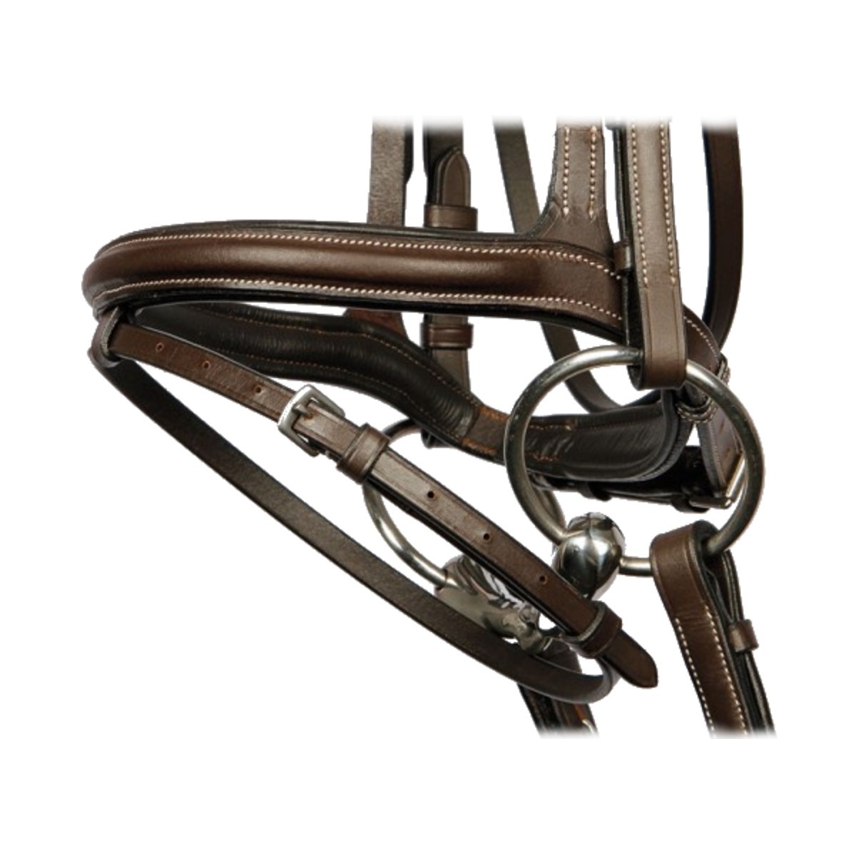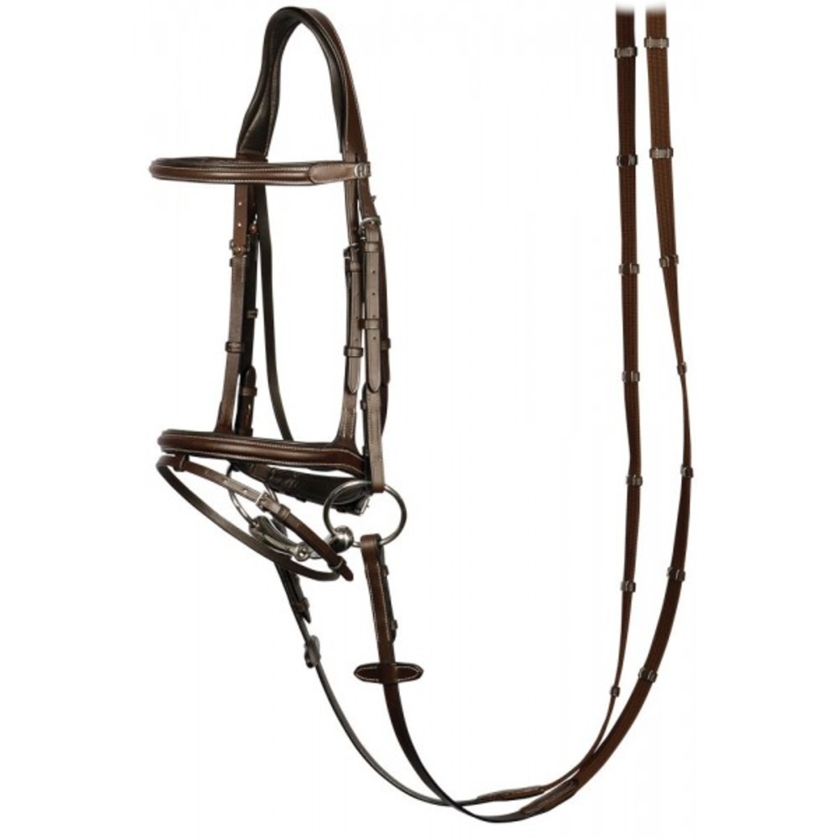 Оголовье из натуральной кожи (Leather Bridle) с контрастной отстрочкой. Мягкие подложки на капсюле, налобном и затылочном ремнях делает уздечку комфортной даже для чувствительных лошадей. В комплекте с уздечкой идет тесьмяный повод с ограничителями и нашивками против скольжения. Затылочный ремень анатомической формы. Нащечные ремни на крючках. Трензель в комплект не входит.