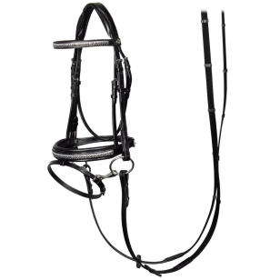 Оголовье трензельное (Leather Bridle) из качественной натуральной кожи. Налобный ремень и капсюль украшены стразами. Мягкая подложка на капсюле и затылочном ремнях делает уздечку комфортной даже для чувствительных лошадей. Нащечные ремни на крючках. В комплект входит тесьмяный повод с нашивками против скольжения. Фурнитура серебристого цвета. Трензель в комплект не входит.