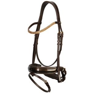 Элегантное оголовье из натуральной кожи (Leather Bridle) с самозатягивающимся капсюлем. Уздечку украшает стильный налобник. Широкий капсюль и затылочный ремени на мягкой подложке, что обеспечивает максимальный комфорт вашей лошади. Капсюль из лаковой кожи. В комплекте с уздечкой идет тесьмяный повод с ограничителями и нашивками против скольжения. Нащёчные ремни на крючках. Фурнитура золотого цвета. Трензель в комплект не входит.