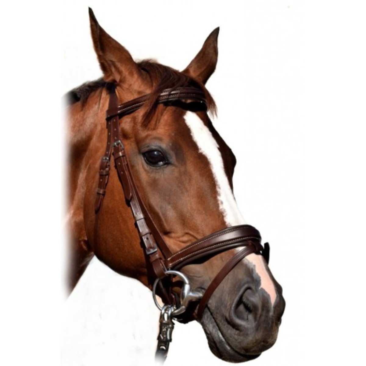 Оголовье (Leather Bridle) из высококачественной кожи с отстрочкой контрастного цвета. Самозатягивающийся капсюль. Подкладка контрастного цвета на капсюле, затылочном и налобном ремнях сделана из мягкой кожи, что обеспечивает максимальный комфорт вашей лошади. Трензель и повод в комплект не входят.