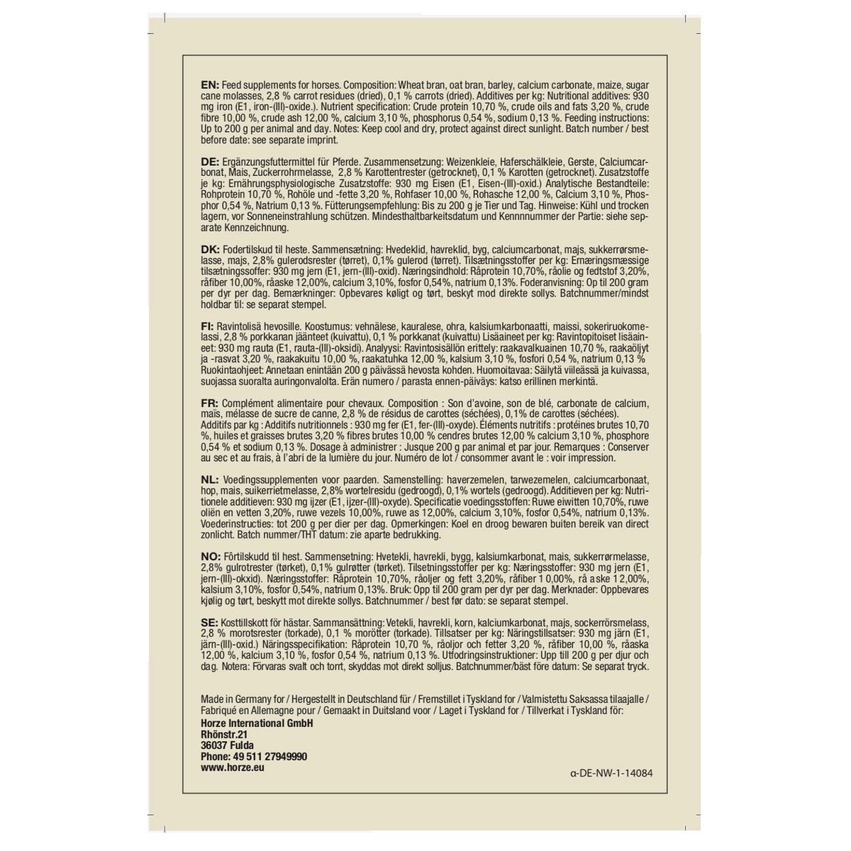 Состав: отруби пшеничные, отруби овсяные, ячмень, карбонат кальция, кукуруза, патока сахарного тростника, 2,8% остатков моркови (сушеные), 0,1% моркови (сушеные).