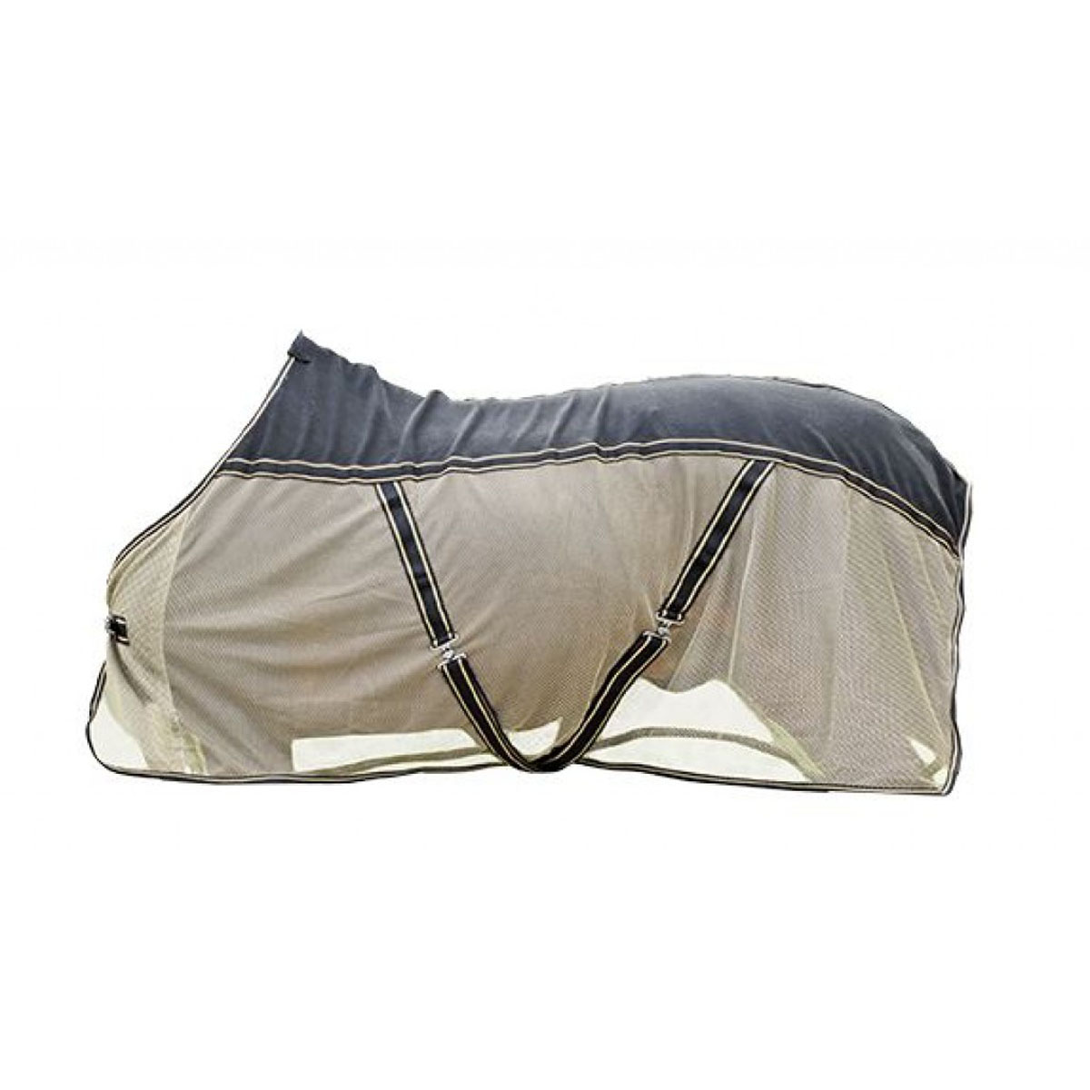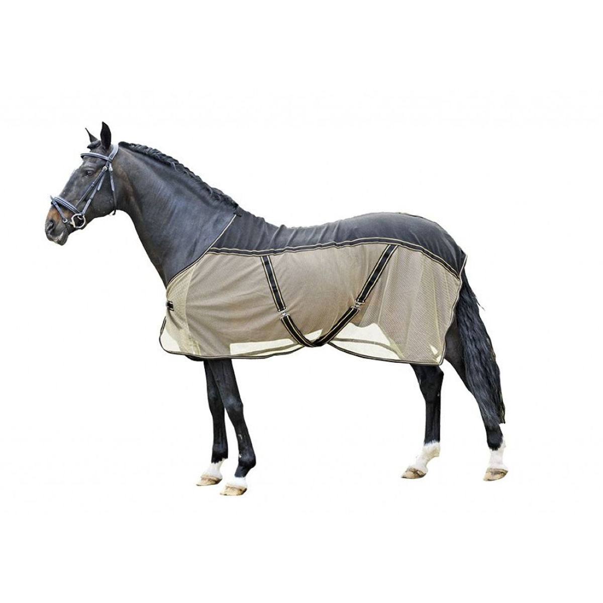 Летняя противомоскитная попона (Anti-fly Rug) из дышащего прочного материала обеспечивает эффективную защиту лошади от насекомых. Попона отлично защищает туловище животного, шею и хвост. Спереди попона застегивается на ремешок с пряжками, Есть петля для хвоста. Имеется отверстие под седло. Подкладка из флиса на спине.