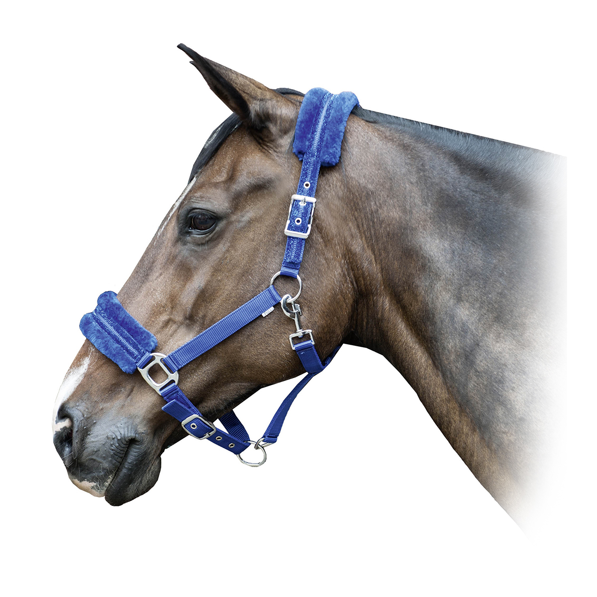 Яркий недоуздок с меховушками (Halter with plush padding). Меховые подложки на носовом и затылочном ремнях предотвращают натирание. Легко снимается и одевается благодаря карабину. Прочная фурнитура серебристого цвета. Подбородный и затылочный ремни регулируются, что обеспечивает идеальную посадку на голове лошади.