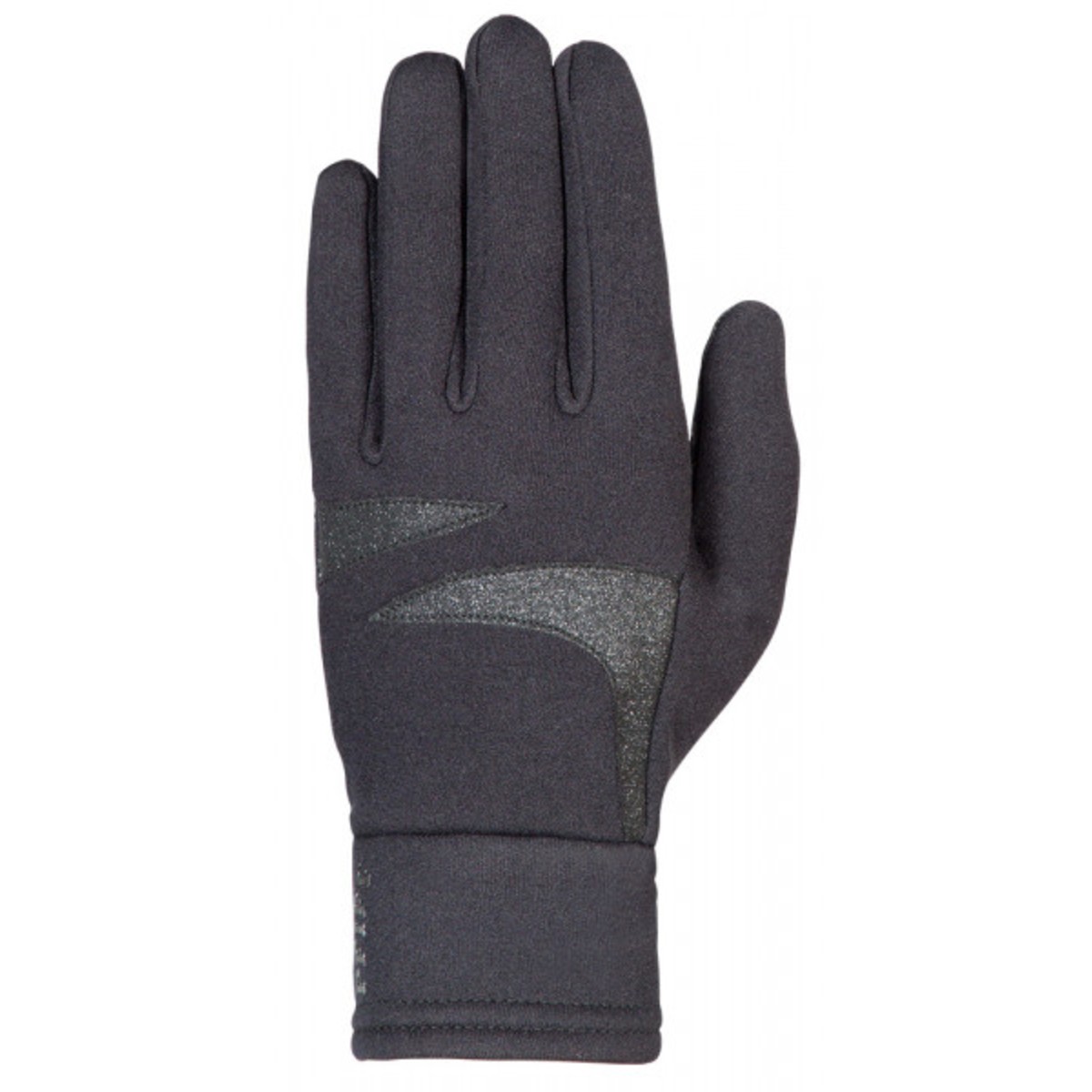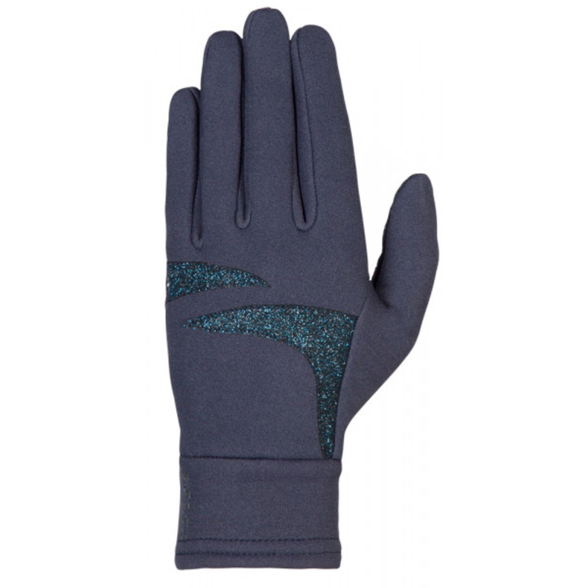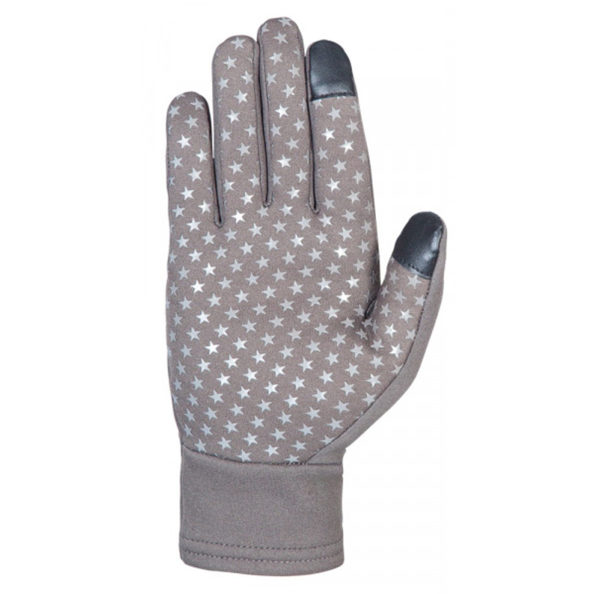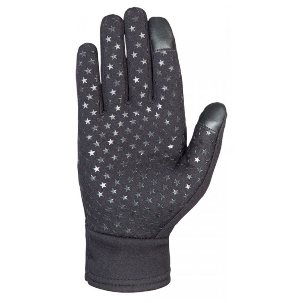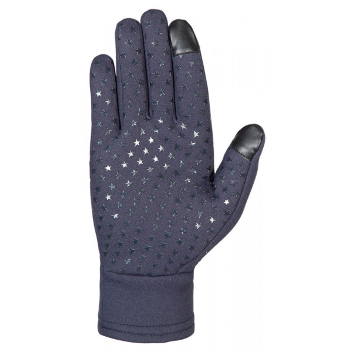 Комфортные теплые зимние перчатки для верховой езды с блестящими аппликациями. Перчатки изготовлены из материала софтшелл с мягкой подкладкой, который очень хорошо адаптируется к руке благодаря своей эластичности. На ладони нанесен нескользящий силиконовый принт в виде звезды. Вкл. Материал, совместимый с сенсорным экраном, на указательном и большом пальцах.
