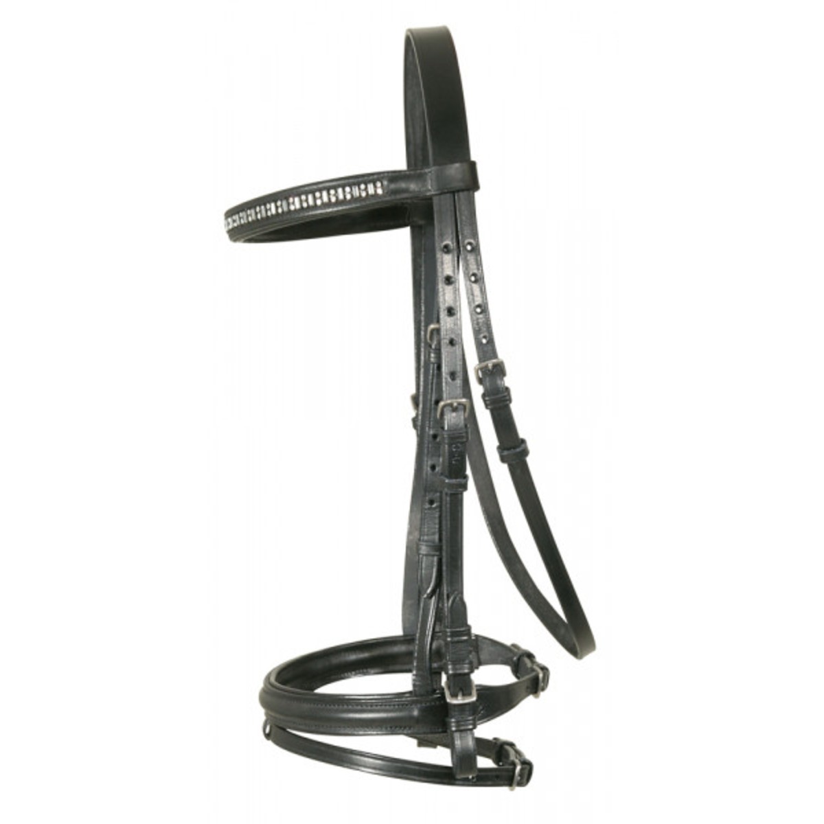 Оголовье из натуральной кожи эконом-класса (Leather Bridle). Подложка на капсюле и налобном ремне делает уздечку комфортной даже для чувствительных лошадей. В комплекте с уздечкой идет тесьмяный повод с нашивками против скольжения. Украшена металлическими камнями серебристого цвета с белой подкладкой, включая сетчатые повязки.