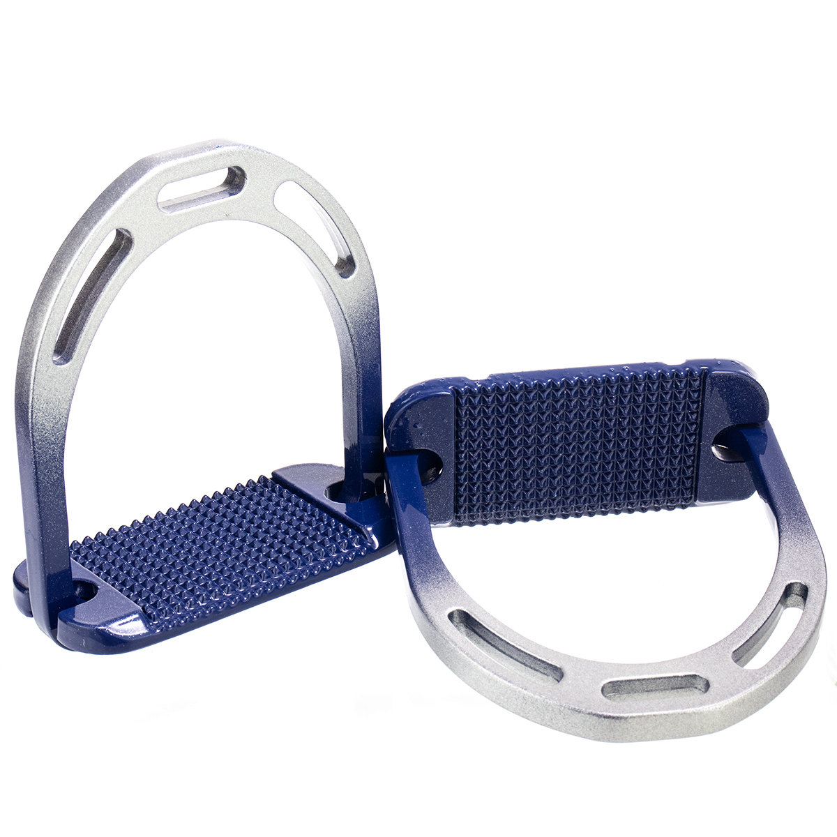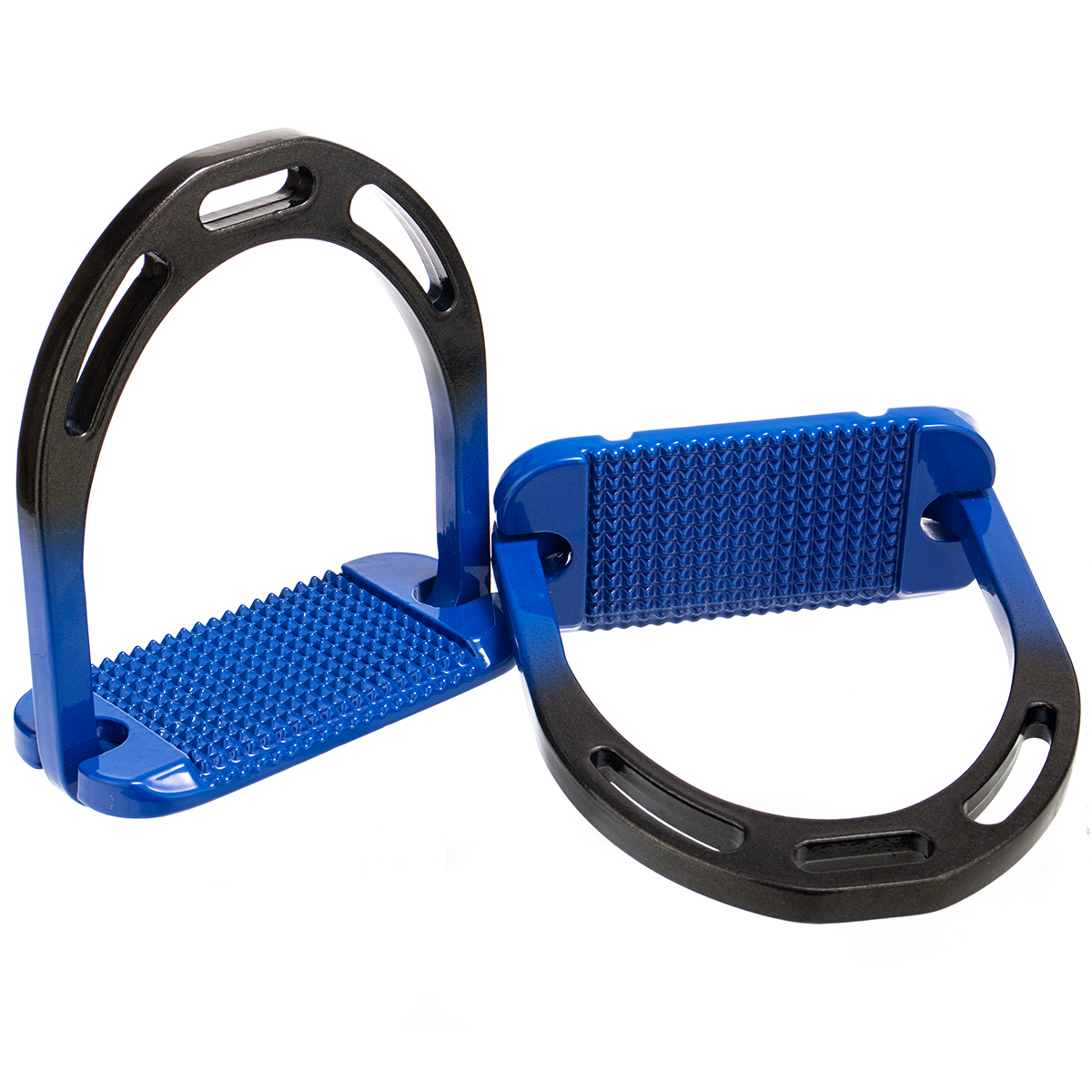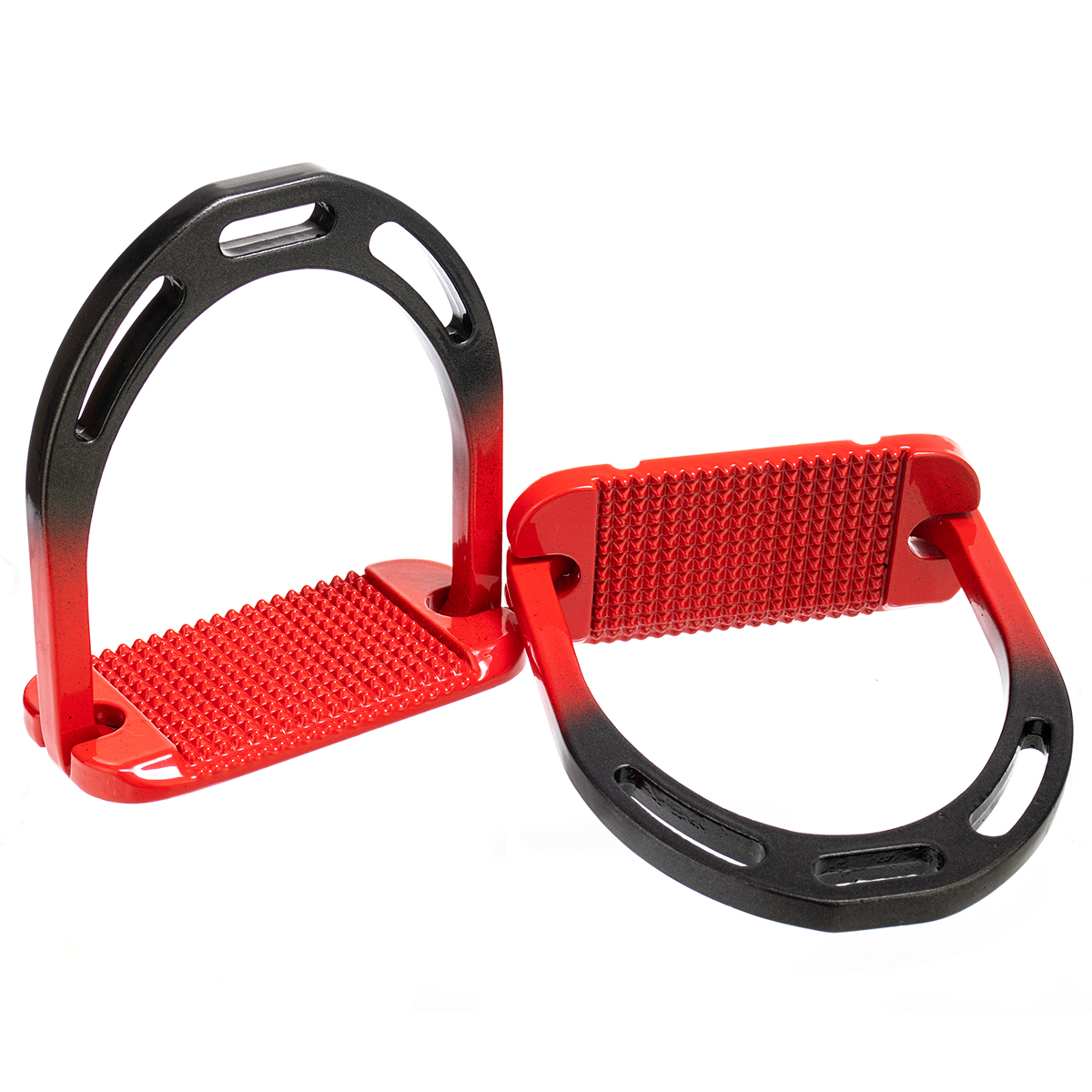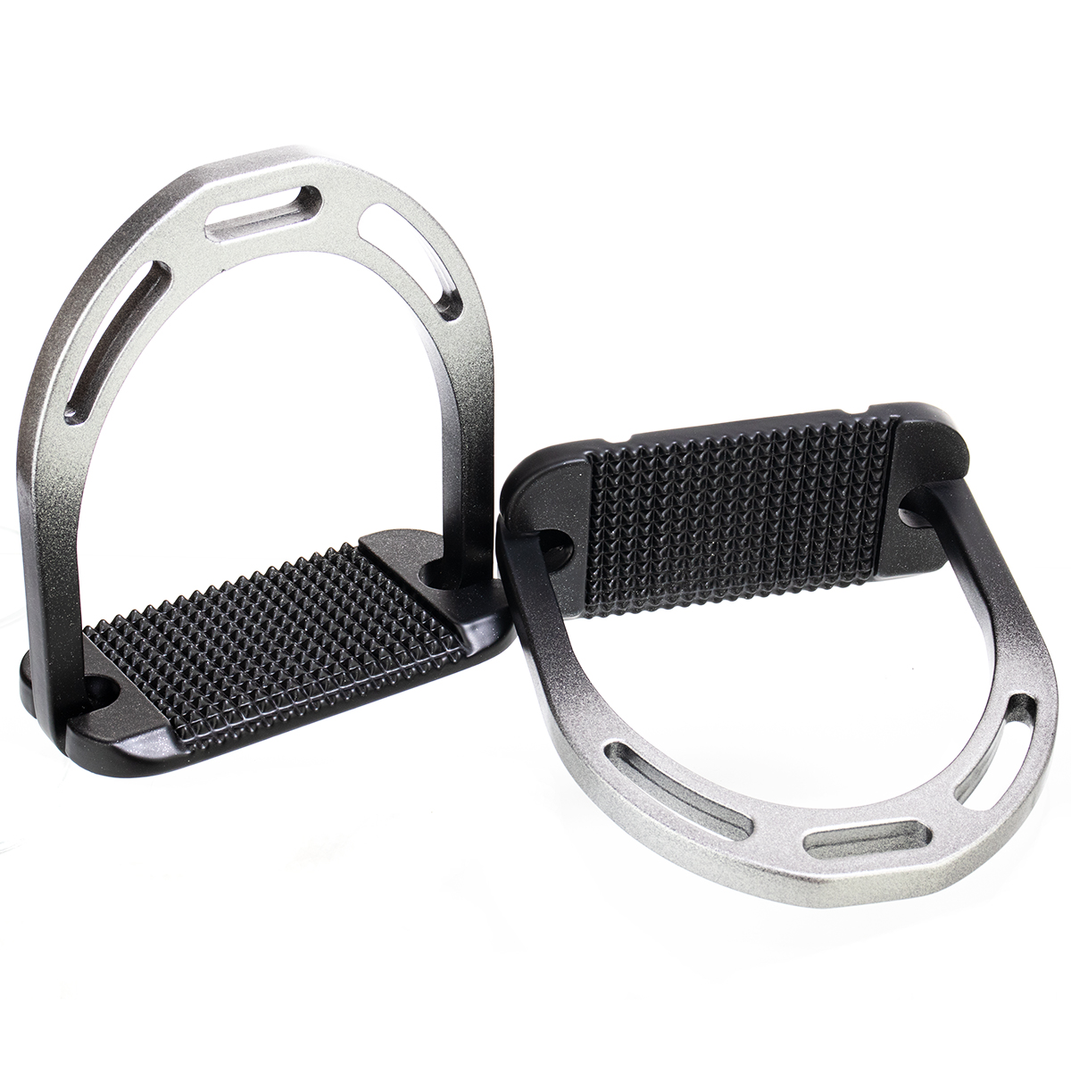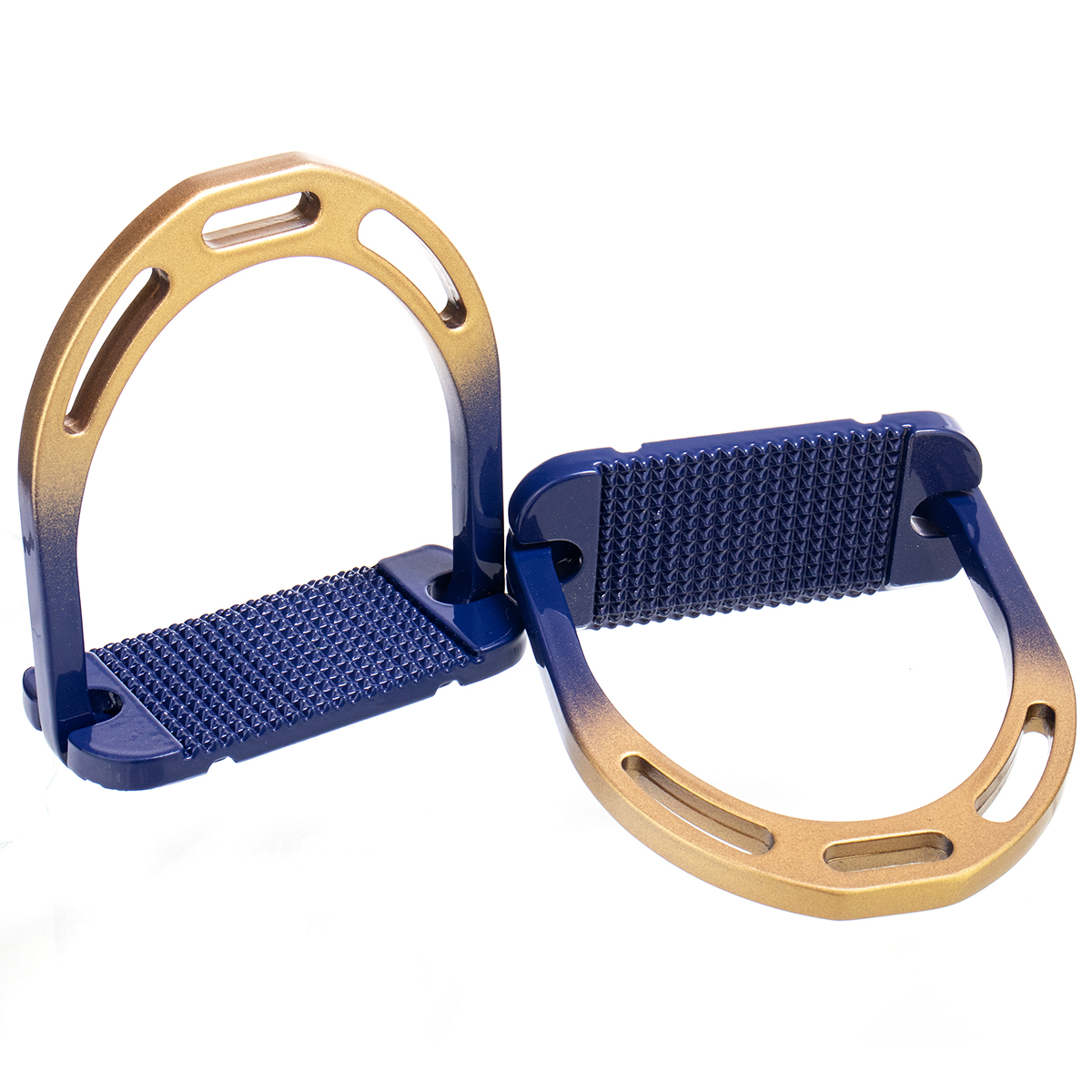 Облегченные алюминиевые стремена (Aluminium stirrup) с глянцевым двухцветным покрытием. Комфортная широкая подошва с анти-скользящей поверхностью и скосом, опускающим пятку вниз.