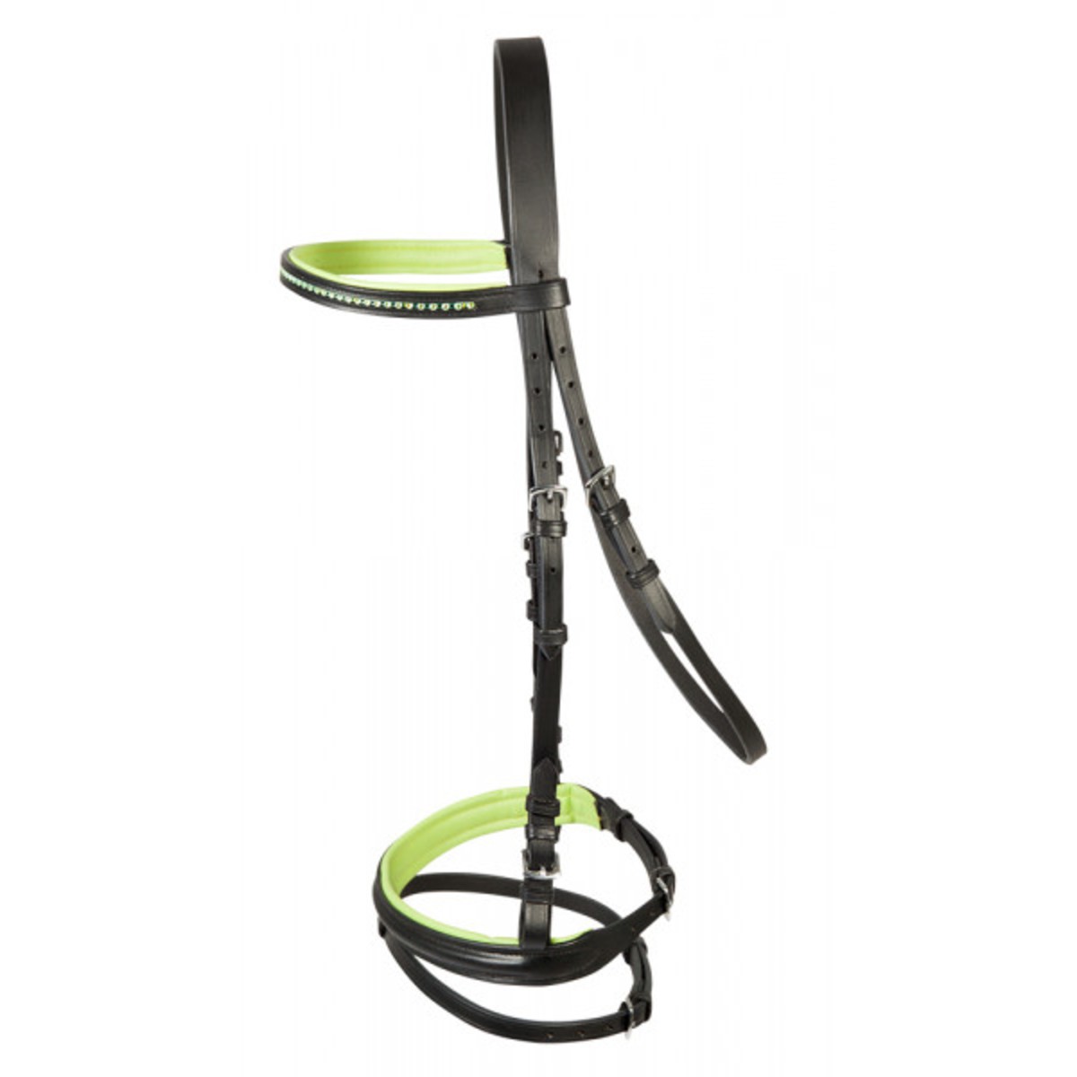 Оголовье из натуральной кожи (Leather Bridle) с подложкой контрастного цвета. Подложка на капсюле и налобном ремне делает уздечку комфортной даже для чувствительных лошадей. В комплекте с уздечкой идет тесьмяный повод с нашивками против скольжения. Украшена стразами серебристого цвета.