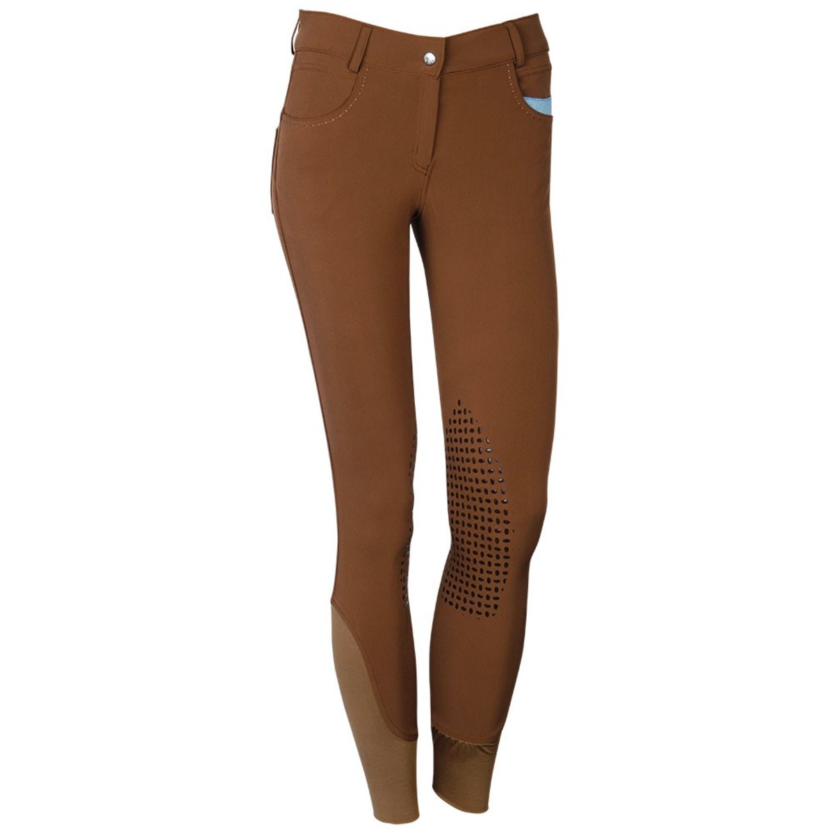 Женские бриджи с коленной силиконовой леей (Breeches with Silicone Patch). Силиконовая лея предполагает отстутствие лишних швов в зоне колен и обеспечивает наибольшую фиксацию в седле. Материал комфортный для тела, "дышащий", эластичный. На бриджах есть два передних набедренных кармана и два кармана сзади. В области щиколотки имеется эластичная вставка для удобства одевания.