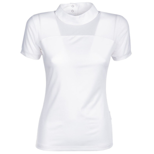 Тонкая блуза для выступлений (Competition Shirt) с приталенным силуэтом, коротким рукавом и воротничком-стойкой. Выполнена из эластичной лёгкой дышащей ткани. На воротничке застегивается на пуговицы-кнопки со стразами. Блуза украшена прозрачной вставкой в области декольта.