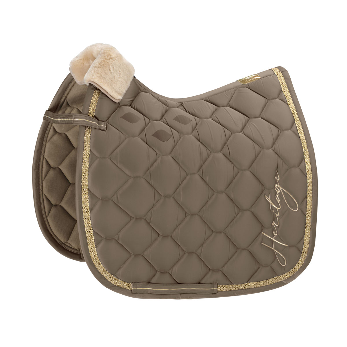 Универсальный вальтрап (All-Purpose Saddle Pad) с блестящей поверхностью и красивой фигурной стежкой. Красивая объемная стежка сотами. широкий золотой кант, специальные силиконовые квадраты, предотвращающие смещение седла, и фирменные вышитые золотом надписи с обоих сторон. Функциональная сетчатая подкладка Cool-Dry быстро выводит пот наружу, оставляя спину лошади сухой. Амортизирующий наполнитель средней толщины обеспечивает комфорт и идеальное поглощение ударов. Отделка плетеным шнуром из люрекса и отстегивающаяся искусственная меховая опушка на холке.
