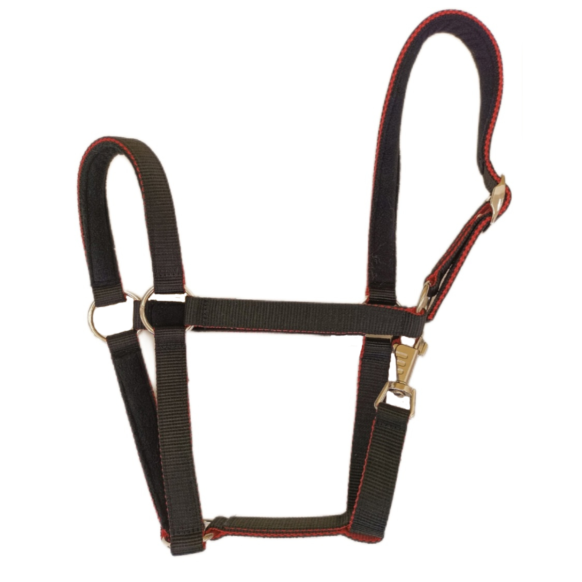 Прочный недоуздок (Halter) из нейлоновой тесьмы на флисовой подложке. Затылочный ремнь регулируется, что обеспечивает идеальную посадку на голове лошади. Фурнитура серебристого цвета.