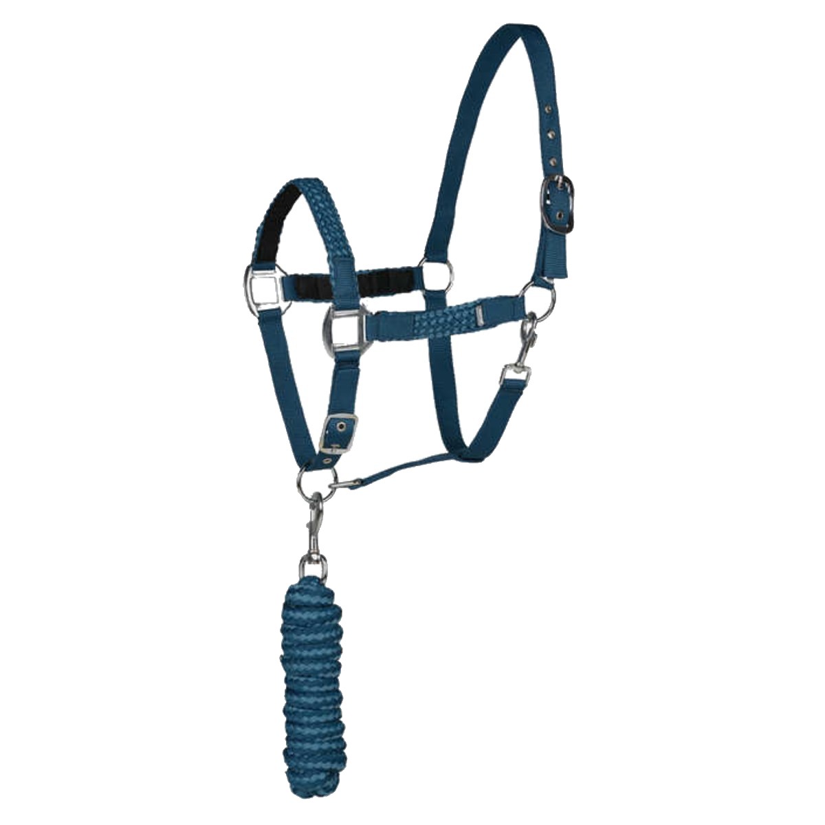 Недоуздок в комплекте с чумбуром (Halter and Lead Set) из прочного полиэстера. Затылочный ремень и носовая часть недоуздка регулируется, что обеспечивает идеальную посадку на голове лошади. На чумбуре длиной 2,25 м имеется простой карабин. Фурнитура серебристого цвета.