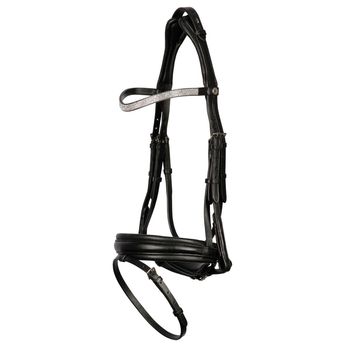 Роскошное трензельное оголовье из натуральной кожи (Leather Bridle) с самозатягивающимся капсюлем. Уздечка особенно комфортна благодаря мягким подложкам на капсюле и затылочном ремне, предотвращающие натирание деталями уздечки морды лошади. Шикарный узкий свисающий налобник с кристаллами. Ширина капсюля 4,8 см включая подложку. Затылочный ремень анатомической формы. Тесьмяные поводья с нашивками против скольжения будут очень удобны для всадника. Прочная фурнитура серебристого цвета из нержавеющей стали. Трензель в комплект не входит.
