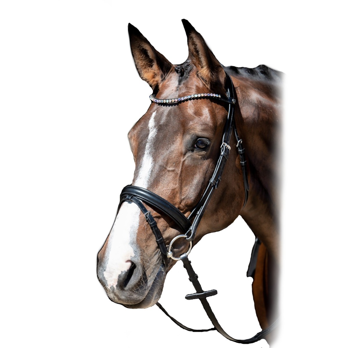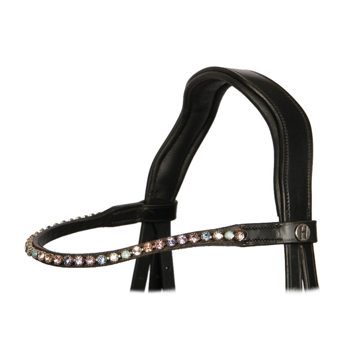 Роскошное трензельное оголовье из натуральной кожи (Leather Bridle). Уздечка особенно комфортна благодаря мягким подложкам на капсюле и затылочном ремне, предотвращающие натирание деталями уздечки морды лошади. Шикарный узкий свисающий налобник с кристаллами. Затылочный ремень анатомической формы. Тесьмяные поводья с нашивками против скольжения будут очень удобны для всадника. Прочная фурнитура серебристого цвета. Трензель в комплект не входит.