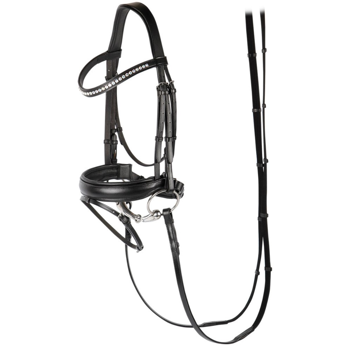 Роскошное оголовье (Leather Bridle) из высококачественной кожи с самозатягивающимся капсюлем. Затылочный ремень анатомической формы и широкий капсюль на мягкой подложке, что обеспечивает максимальный комфорт вашей лошади. Налобный ремень украшен крупными стразами. В комплект входит тесьмяный повод с ограничителями.