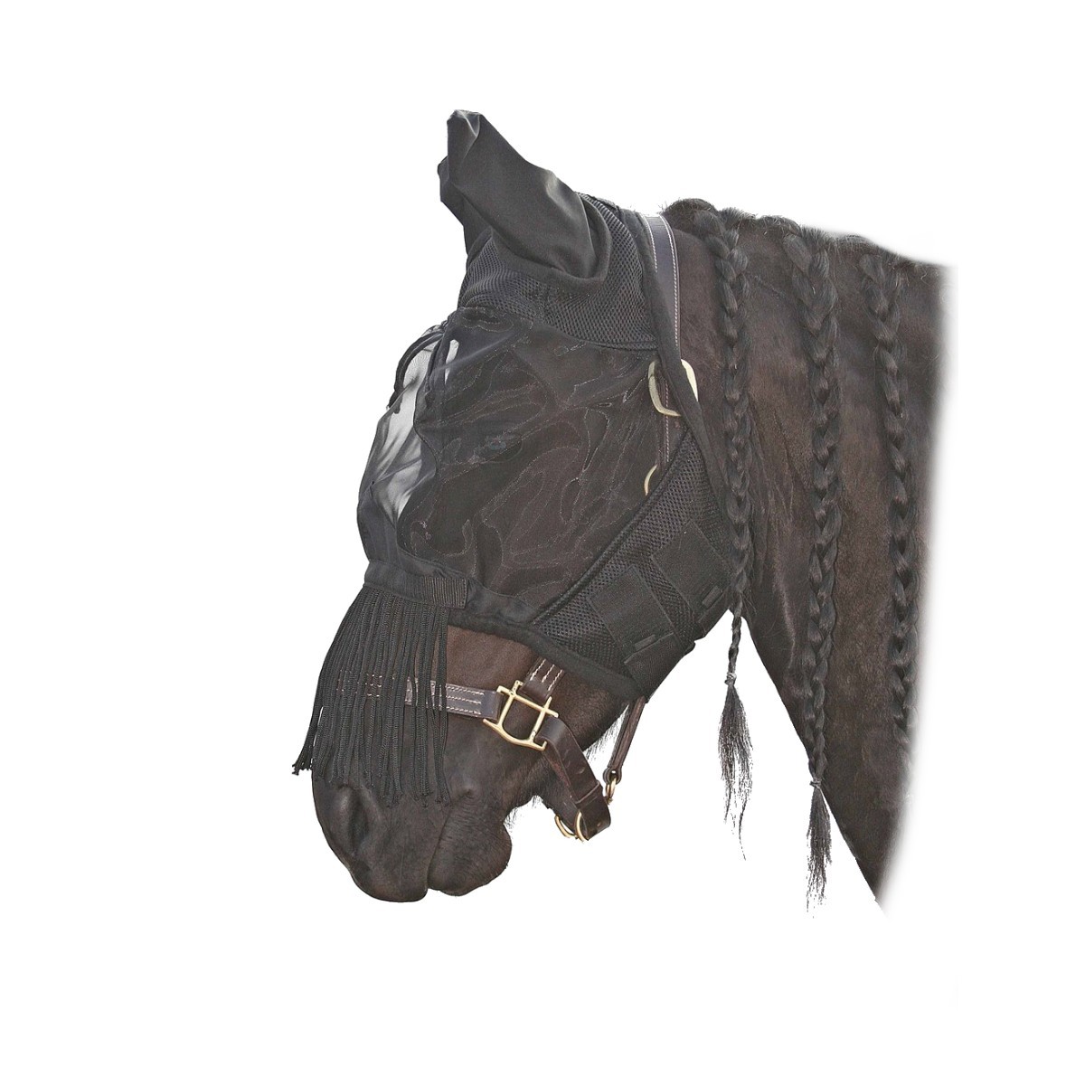 Маска закрывает чувствительные области головы лошади от назойливых летающих насекомых. Супер-мягкая микросетка не натрет кожу и не позволит голове лошади перегреться под жарким солнцем, а благодаря специальным вытачкам сетка не будет касаться глаз и не вызовет их раздражение. Мягкая нейлоновая микросетка защищает чувствительные мягкие ткани глаз и носа лошади. Маска надежно фиксируется на голове лошади с помощью застежек-липучек.