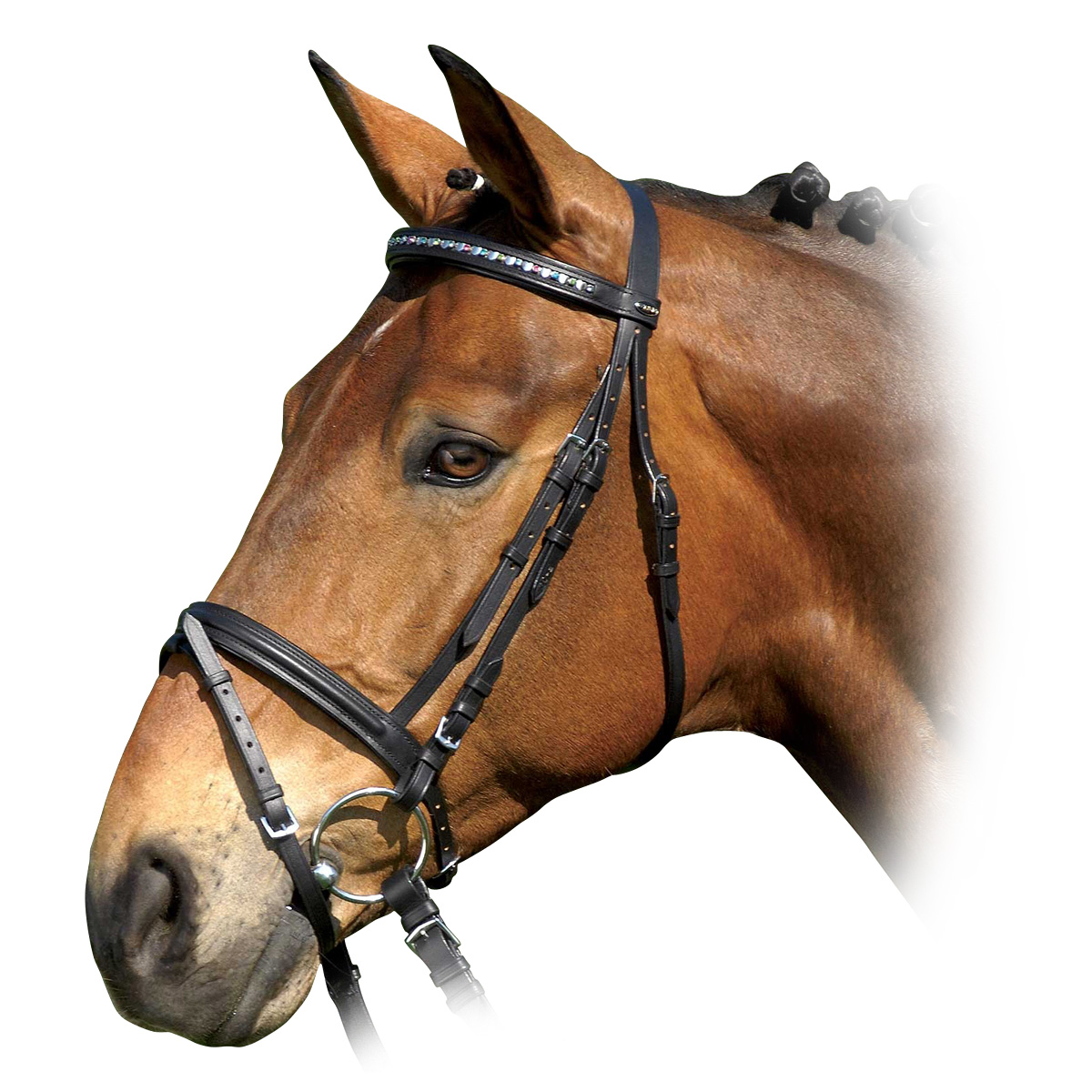Трензельное оголовье с налобником украшенным стразами в виде сердечек. Налобный ремень украшен прозрачными или цветными стразами. В комплект входит повод тесьмяный с нашивками против скольжения. Трензель в комплект не входит.