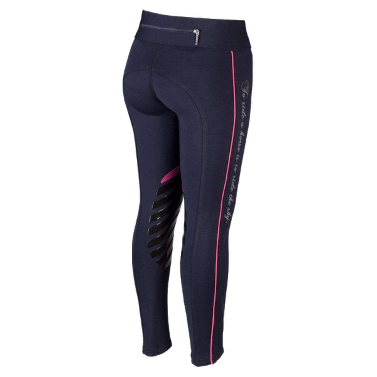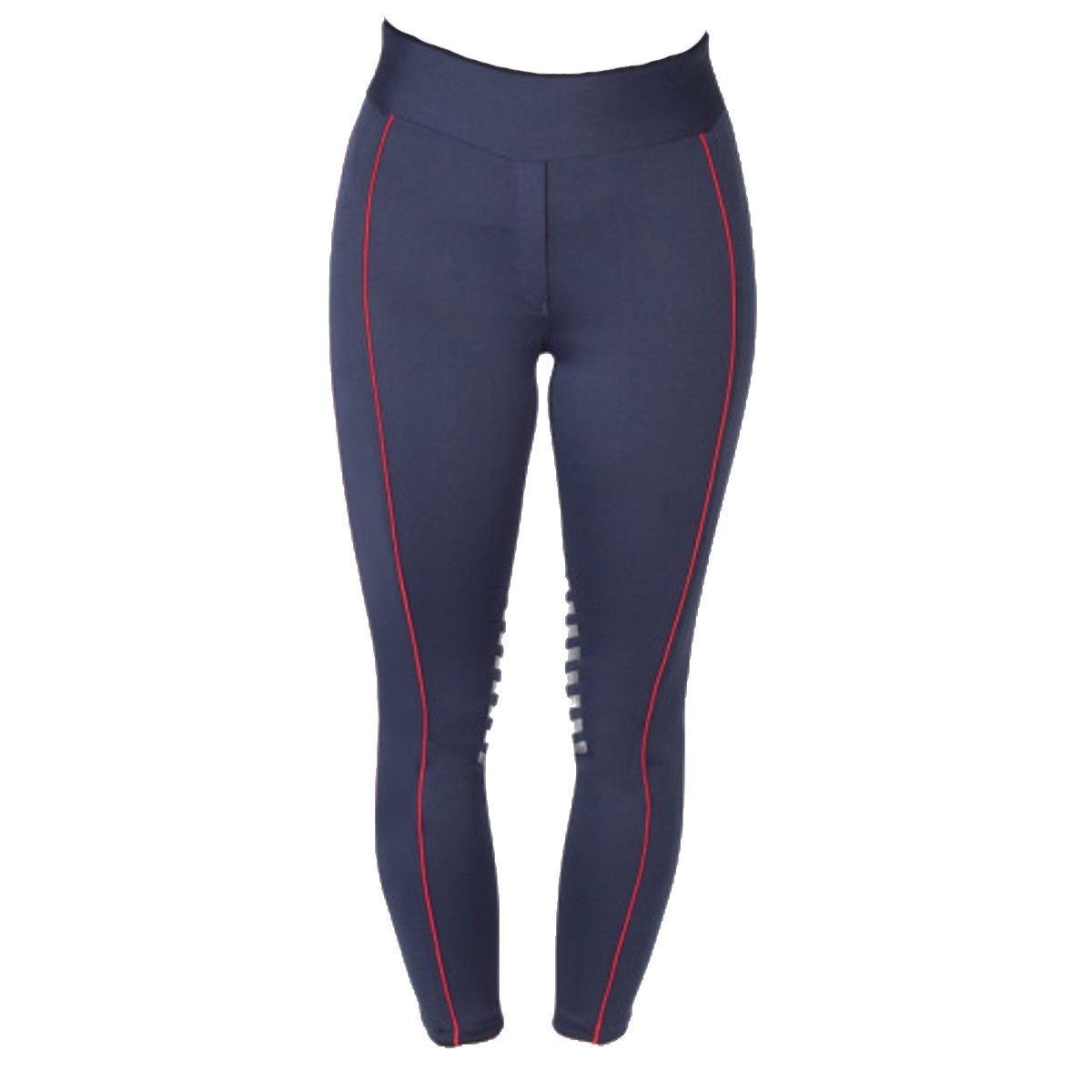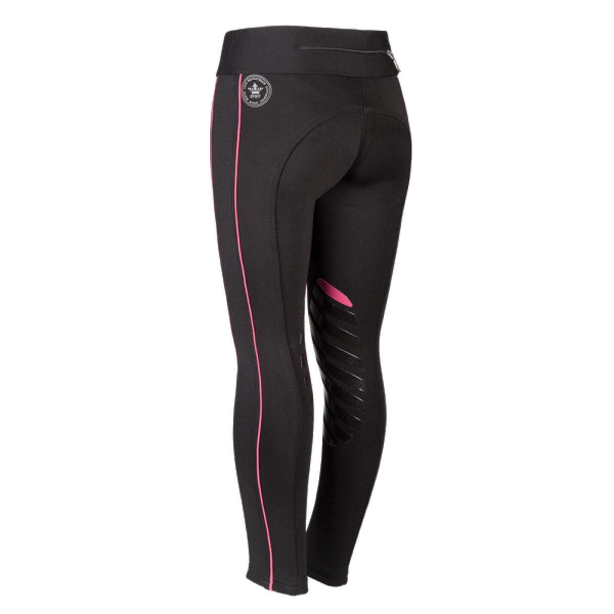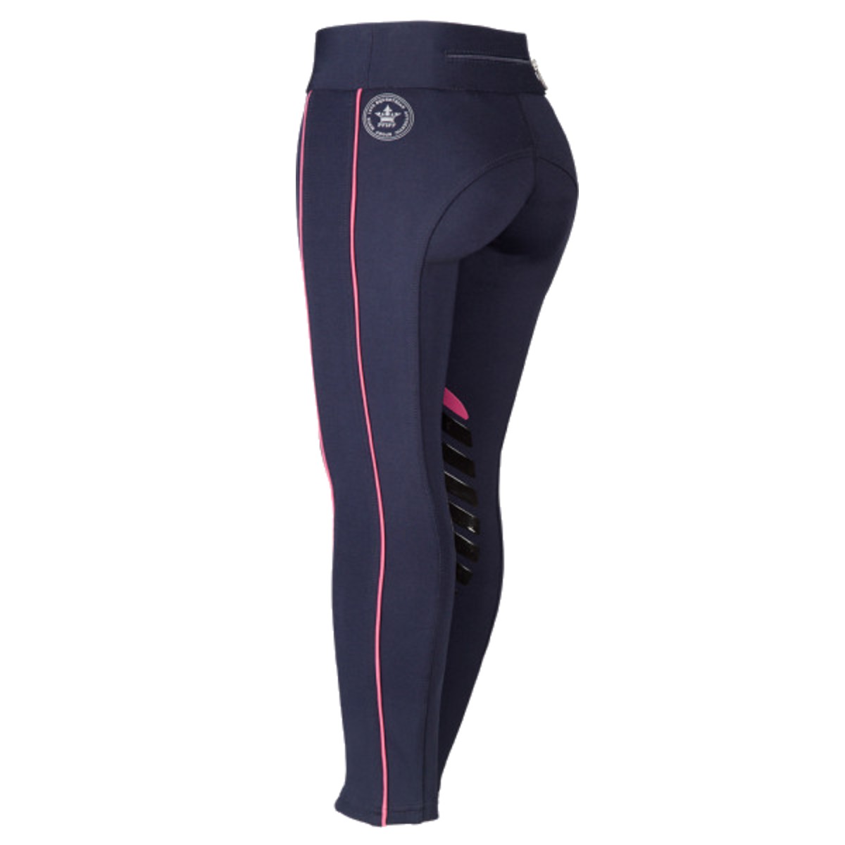 Леггинсы с коленной силиконовой леей (Breeches with Silicone Knee Patch). Силиконовая лея предполагает отстутствие лишних швов в зоне колен и обеспечивает наибольшую фиксацию в седле. Материал комфортный для тела, "дышащий", эластичный. Вдоль штанины идет контрастная вставка. Сзади на поясе есть карман на замке. В области щиколотки эластичная вставка.