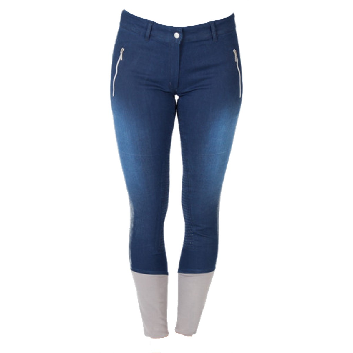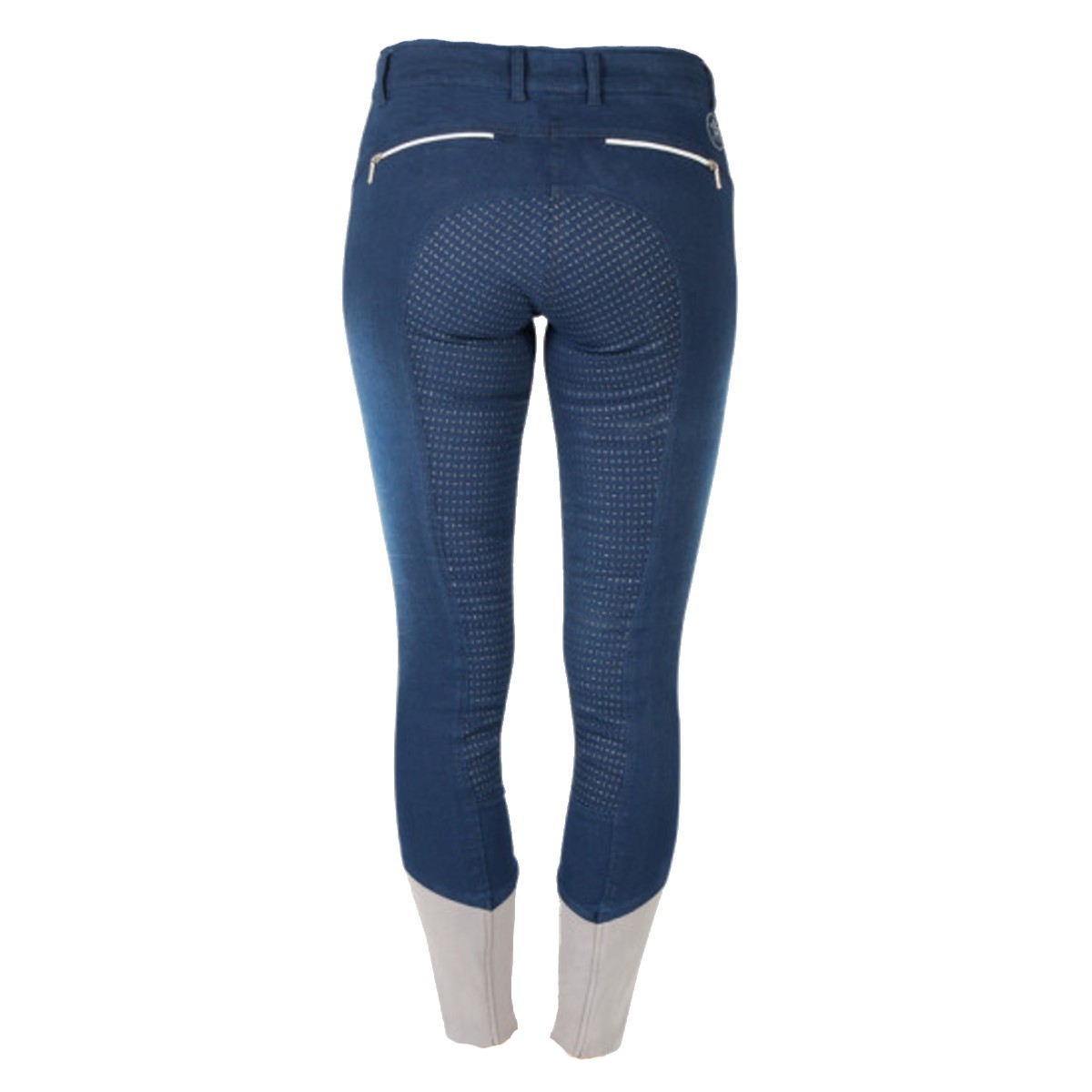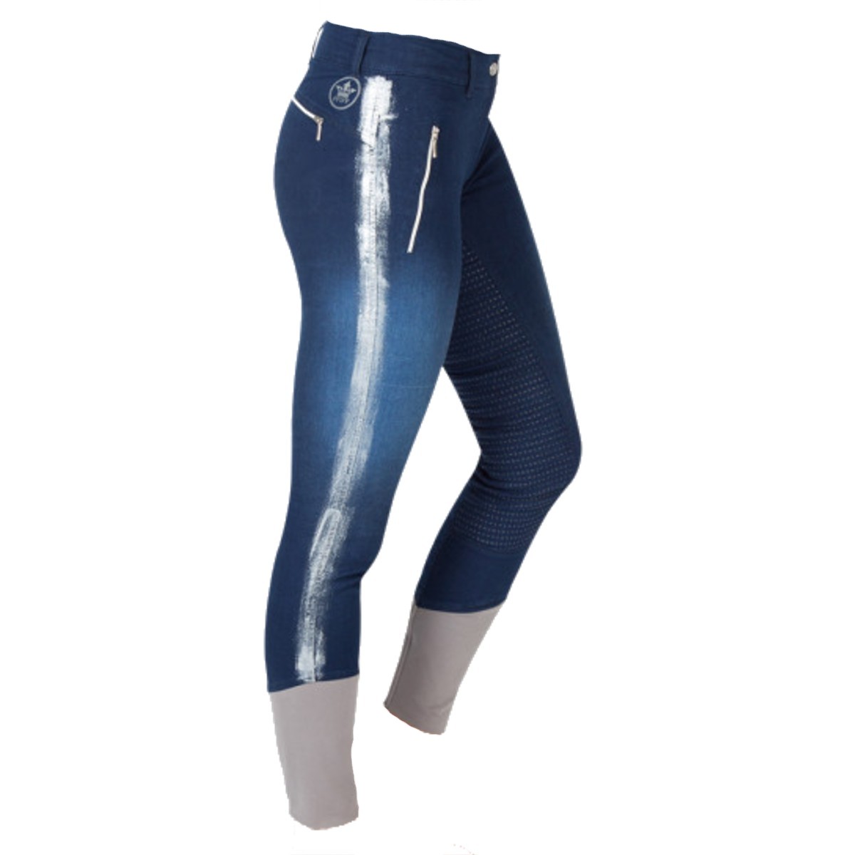 Стильные джинсовые бриджи с полной силиконовой леей (Breeches with Silicone Patch). Благодаря отличным эластичным качествам, прекрасно сохраняют форму и дают свободу движениям. Бриджи хорошо обтягивают фигуру. На поясе петли для ремня. Два передних кармана и два кармана сзади на молнии. Благодаря контрастной отделке серебристого цвета, бриджи выглядят стильно. В области щиколотки эластичная вставка красного цвета.