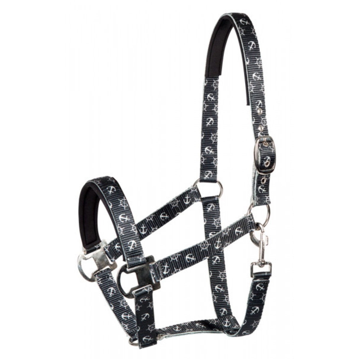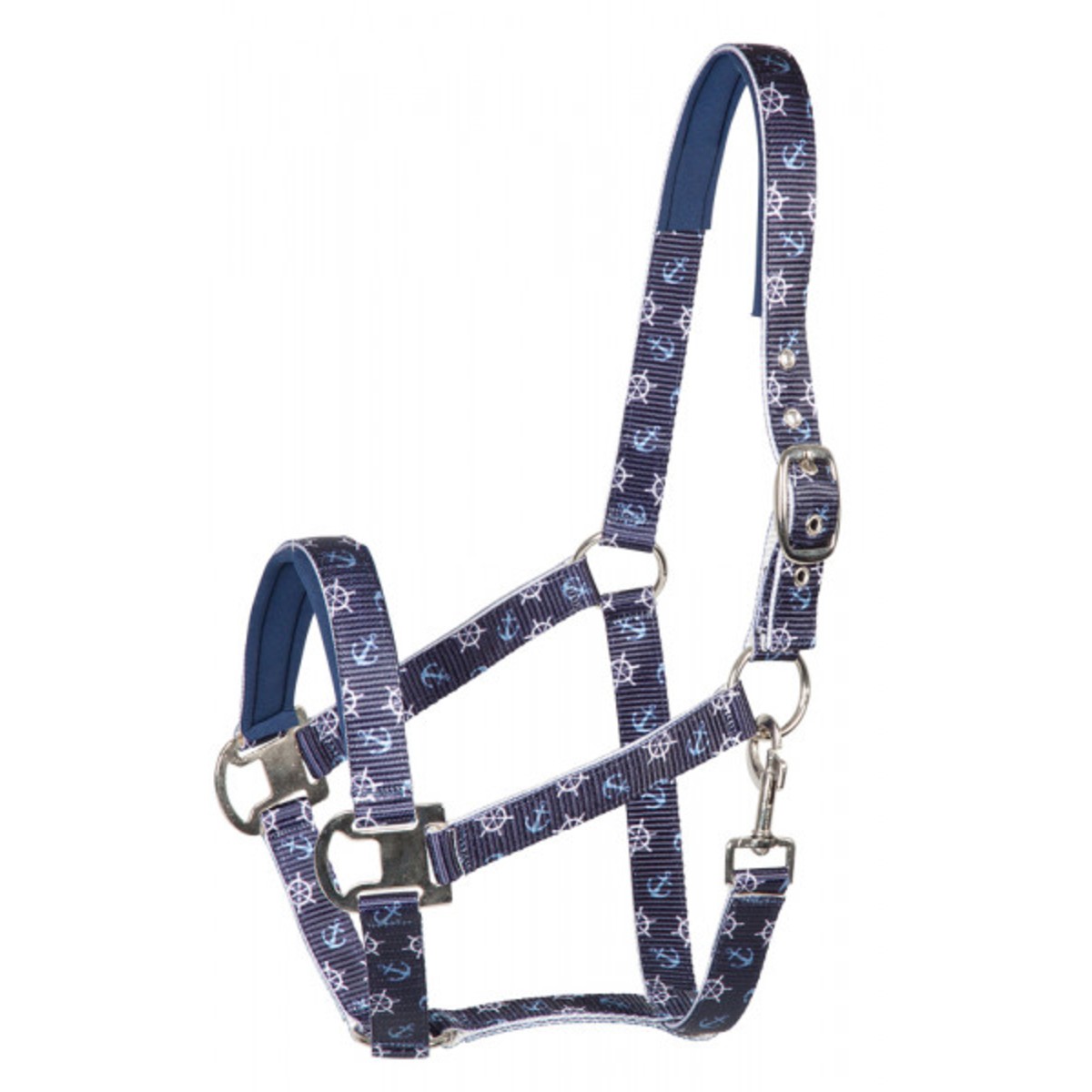 Недоуздок украшен принтом с морскими мотивами. Затылочный и носовой ремни имеют мягкую неопреновую подложку, что предотвращает натирание. Регулируется на затылочном ремне, что обеспечивает идеальную посадку на голове лошади. Недоуздок легко снимается и одевается благодаря карабину. Фурнитура серебристого цвета.