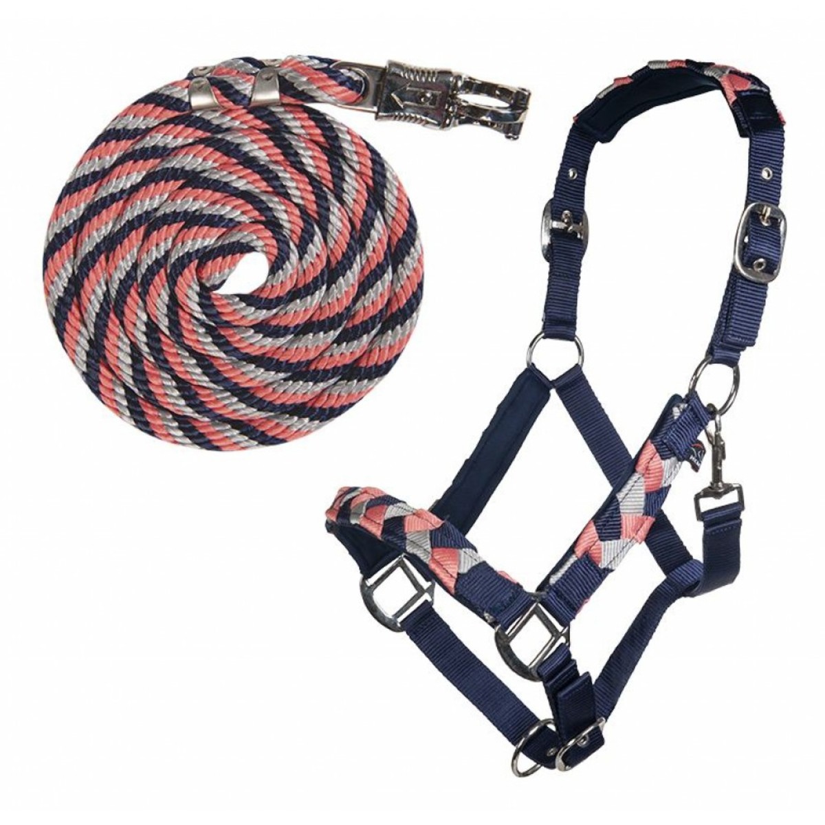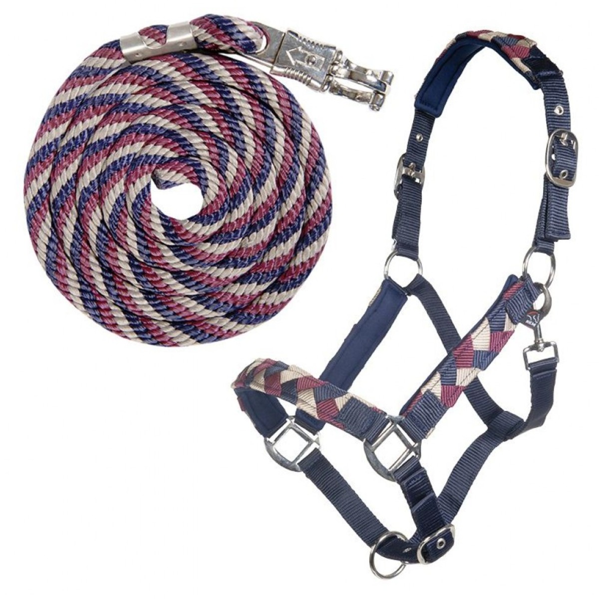 Прочный цветной недоуздок в комплекте с чумбуром (Halter and Lead Set). Затылочный и носовой ремни имеют мягкую неопреновую подложку, что предотвращает натирание. Затылочный и носовой ремени на недоуздке регулируются. На чумбуре длиной 1,8 м имеется безопасный карабин. Фурнитура серебристая.