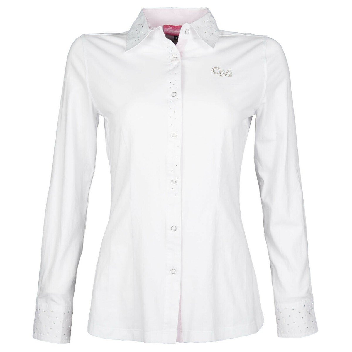 Элегантная блуза с длинным рукавом (Competition blouse) для выступлений. Застёгивается на пуговицы. Стразы на воротнике, на манжетах рукавов и вдоль планки застежки. На груди фирменная вышивка со стразами. Воздухопроницаемый быстро впитывающий влагу материал.