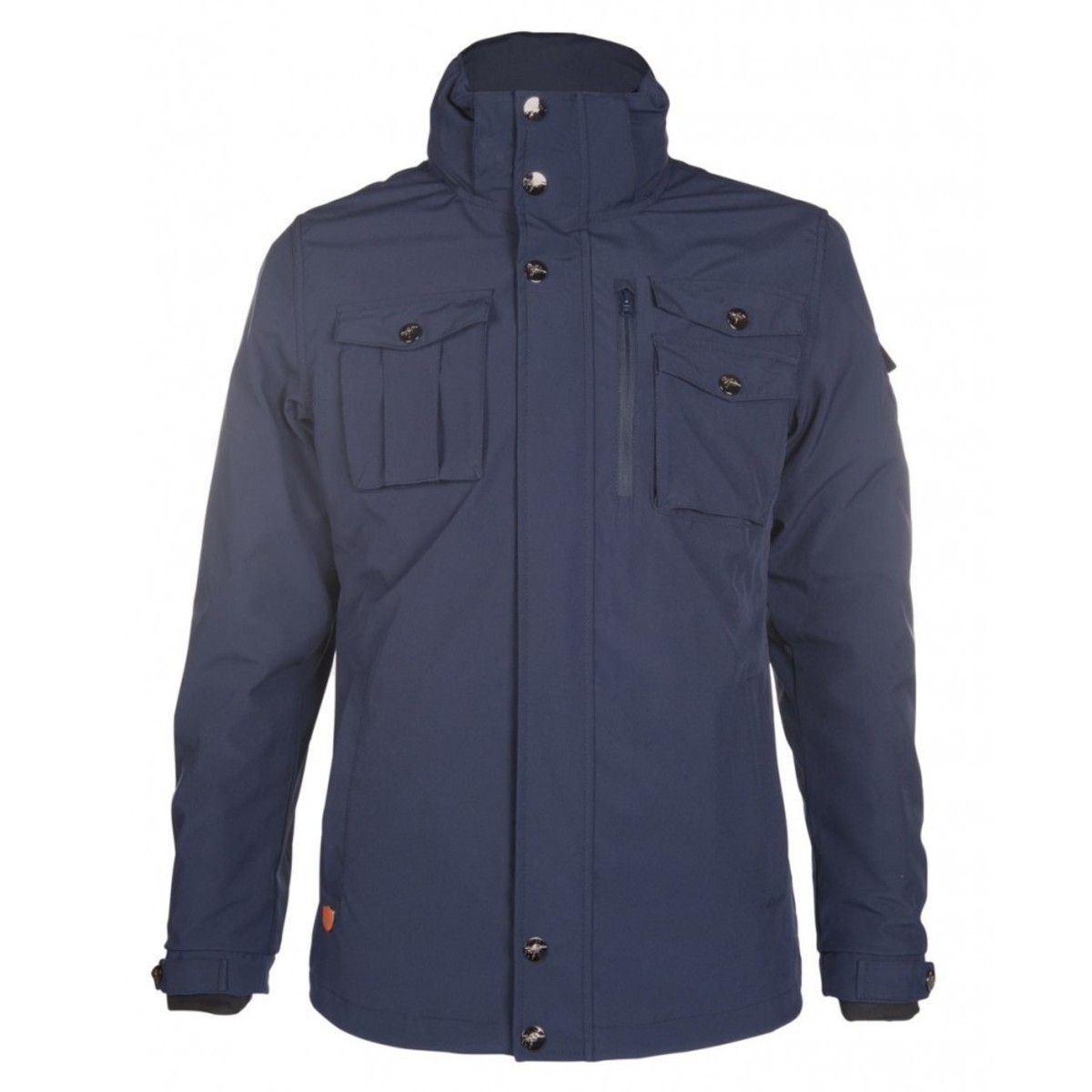-потайной капюшон с регулировкой объёма, -воротник-стойка, -застёжка на молнию, -ветрозащитная планка с кнопками, -манжеты с клапанами для регулировки объёма, -вентиляционные отверстия под рукавами, -два боковых кармана с молниями, -два накладных кармана на груди на кнопках, один на замке, -карманы внутри: на молнии и на липучке, -карман на левом рукаве с фирменным логотипом.