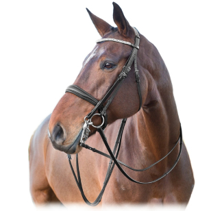 Шикарное мундштучное оголовье (Weymouth Bridle) с самозатягивающимся капсюлем. Налобник изогнутой формы украшен стразами. Капсюль и затылочный ремень на мягкой подложке, что обеспечит максимальный комфорт вашей лошади. Нащёчные ремни застегиваются на крючки. Фурнитура серебристого цвета.