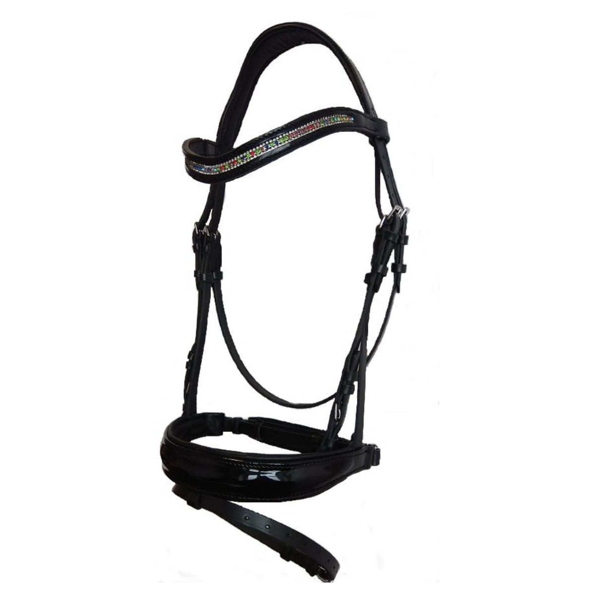 Оголовье из высококачественной натуральной кожи (Leather Bridle) с самозатягивающимся капсюлем. Мягкая подложка на капсюле, налобном и затылочном ремнях делает уздечку комфортной даже для чувствительных лошадей. Налобный ремень украшен разноцветными стразами. Затылочный ремень анатомической формы. Широкий капсюль выполнен из лаковой кожи.