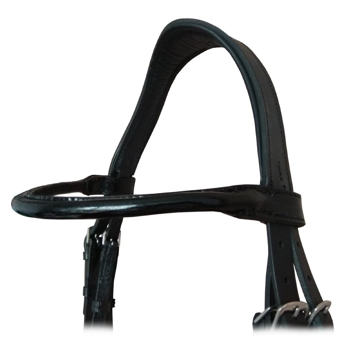Оголовье из натуральной кожи (Leather Bridle) с самозатягивающимся капсюлем и дутым налобником. Мягкая подложка на капсюле и затылочном ремне делает уздечку комфортной даже для чувствительных лошадей. Налобник и широкий капсюль выполнен из лаковой кожи. Затылочный ремень анатомической формы.